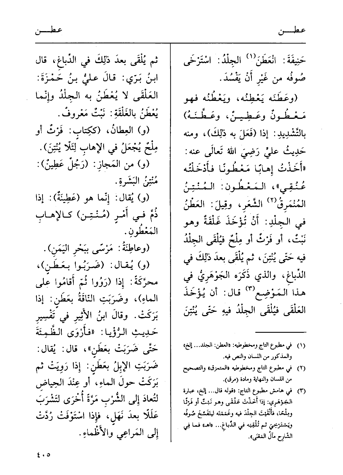 حَنيفَةَ: العطنُ: الجِلْدُ اسْتَرْخَى صوفُه مِن غيرِ أنْ يَفْسُدَ، (وعَطَنَه يَعْطِنُه ويَعْطُنُه فَهُوَ مَعْطونٌ وعَطِينٌ وعَطَّنَهُ) ، بالتَّشديدِ: إِذا (فَعَلَ بِهِ ذلِكَ) .