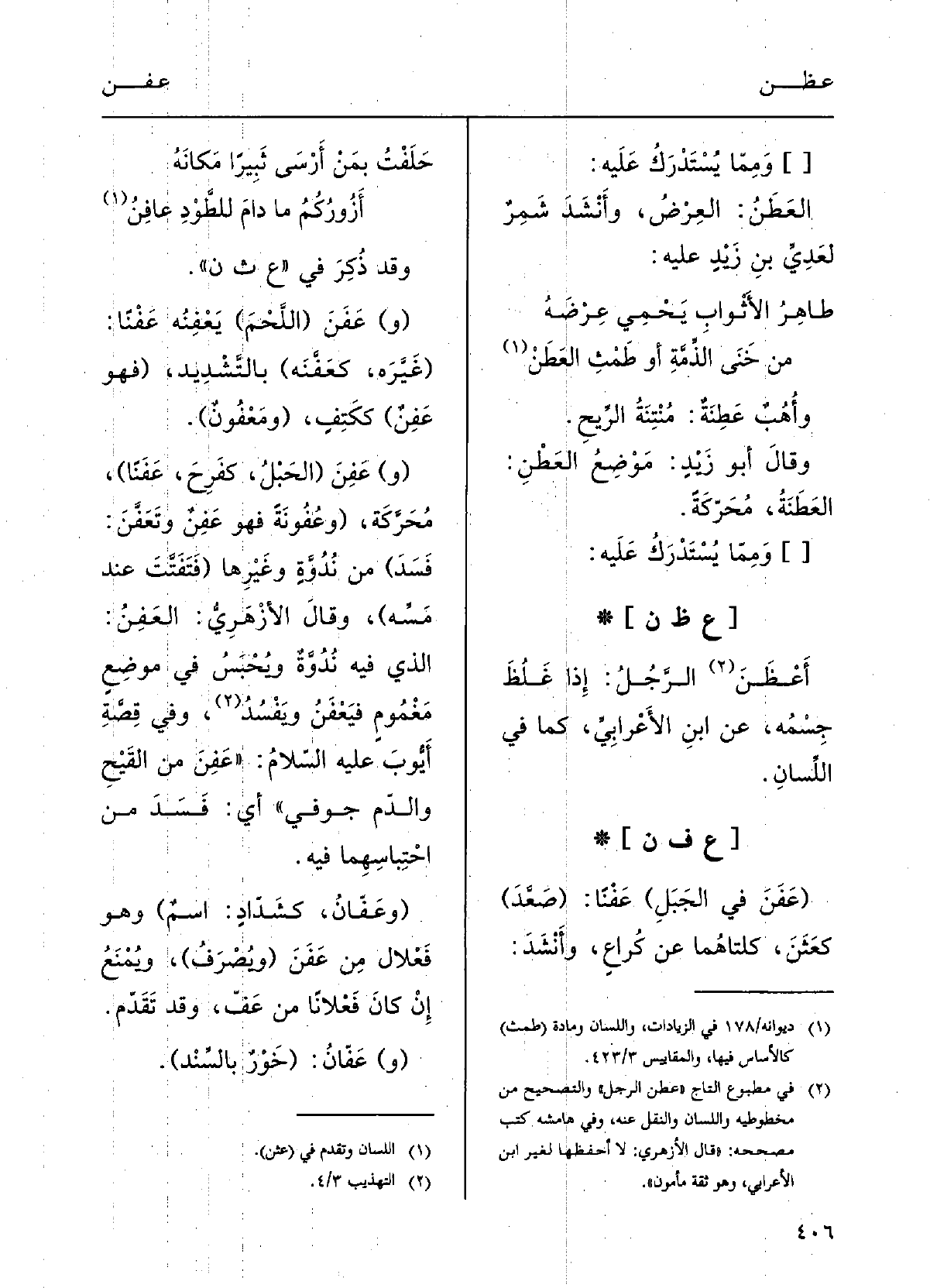 : (عفَنَ فِي الجَبَلِ) عَفْناً: (صَعَّدَ) ، كعَثَنَ، كِلْتاهُما عَن كُراعٍ، وأَنْشَدَ: