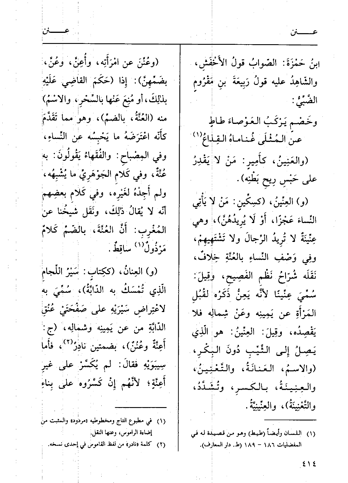 ونَقَلَ شيْخُنا عَن المغربِ: أَنَّ {العُنَّة، بالضمِّ، كَلامٌ مَرْدودٌ ساقِطٌ.
