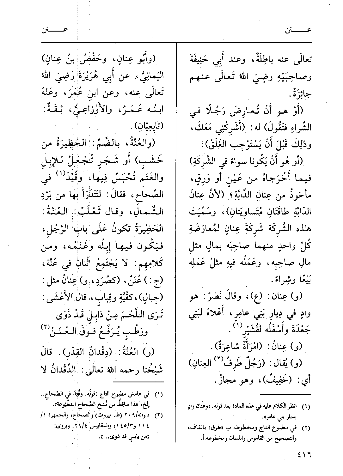 وقالَ ثَعْلَب: {العُنَّةُ: الحَظِيرَةُ تكونُ على بابِ الرَّجُلِ فَيكون فِيهَا إبِله وغَنَمه.