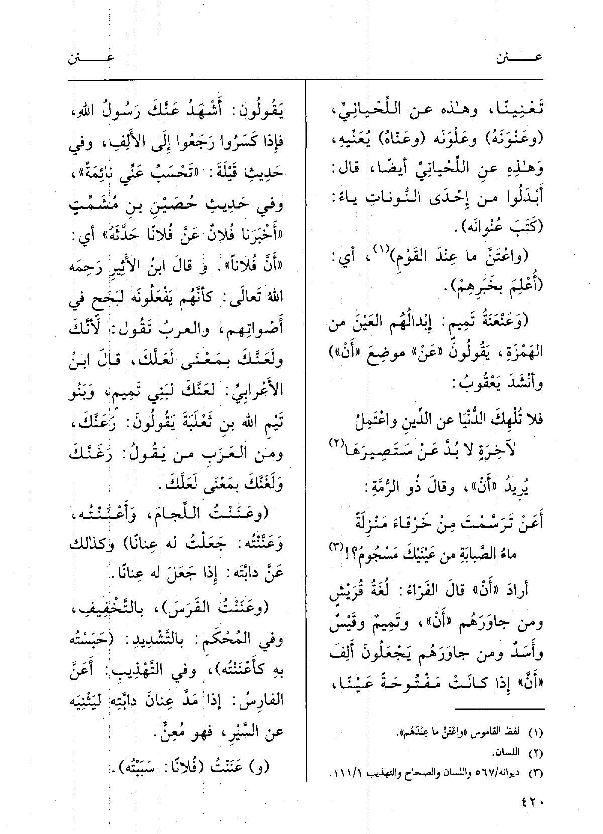 قالَ ابنُ الأعرابيِّ: لَعَنَّك لبَنِي تَمِيمٍ، وبَنُو تَيْم الله بنِ ثَعْلَبَة يقُولُون: رَعَنَّك، ومِنَ العَرَبِ مَنْ يَقُول: رَغَنَّك ولَغَنَّك بمعْنَى لَعَلَّكَ ( {وعَنَنْتُ الِّلجامَ} وأعْنَنْتُه {وعَنَّتْهُ: جَعَلْتُ لَهُ} عِناناً) ؛ وكذلِكَ عَنَّ دابَّتَه: إِذا جَعَلَ لَهُ عِناناً.
