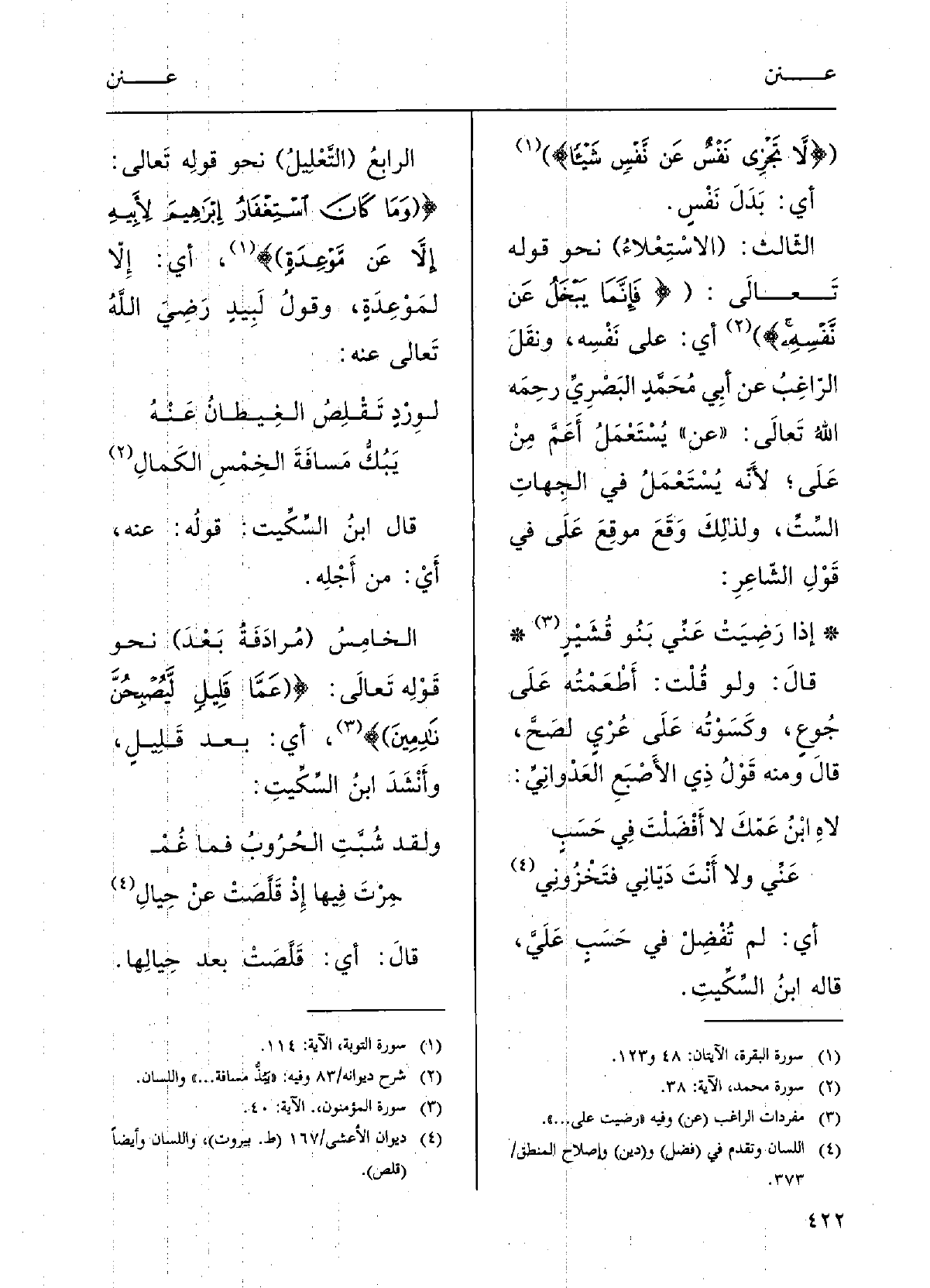 الرّابعُ: (التَّعْليلُ) ، نحْوَ قوْلِه تَعَالَى: {وَمَا كانَ اسْتِغْفارُ إبراهيمَ لأبيهِ إلاَّ عَن مَوْعِدَةٍ} ، أَي إلاَّ لمَوْعِدَةٍ، وقَوْلُ لبيدٍ، رضِيَ الّله تَعَالَى عَنهُ: