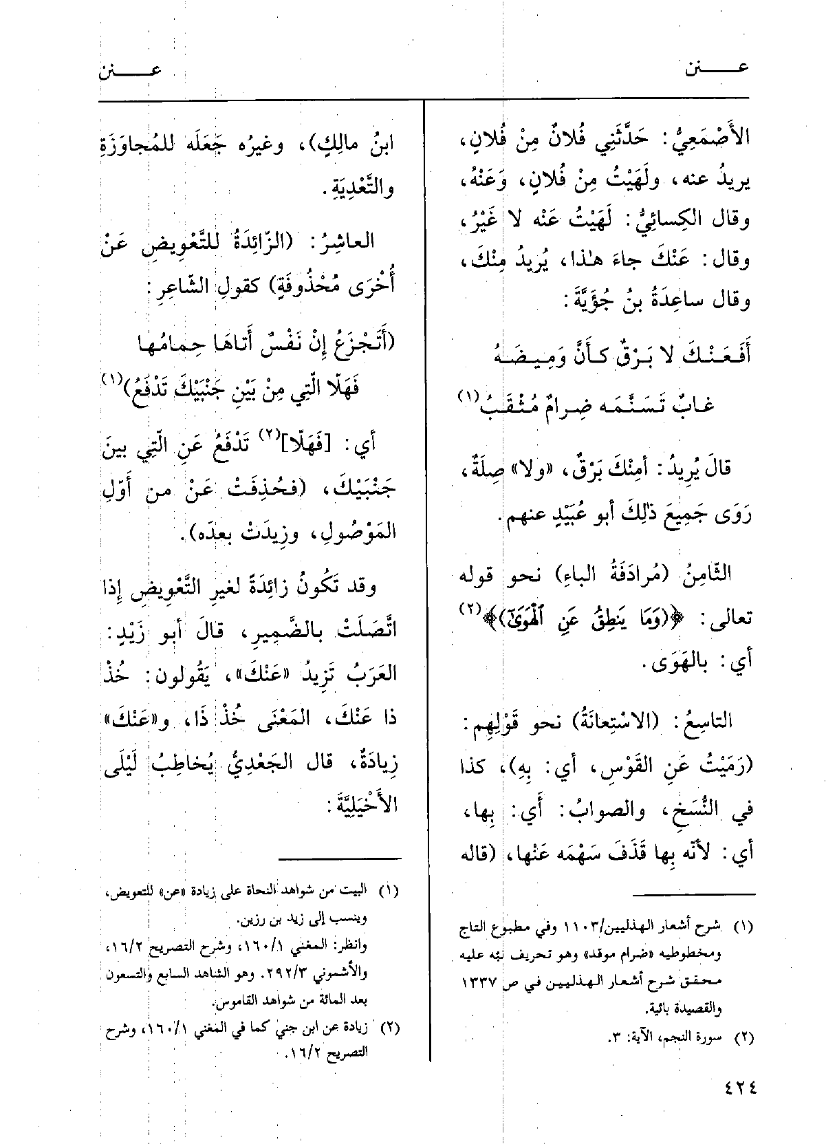 (أَتَجْزَعُ أَن نَفْسٌ أَتاها حِمامُها (فَهَلاَّ الَّتِي عَن بَيْنَ جَنْبَيْكَ تَدْفَعُ) أَي تَدْفَعُ عَن الَّتِي بَيْنَ جَنْبَيْك، (فَحُذِفَتْ عَن من أَوَّلِ المَوْصُولِ وزِيْدَتْ بَعْدَهُ) ، وَقد تكونُ زائِدَةً لغيرِ التَّعْويضِ إِذا اتْصَلَتْ بالضَّميرِ.