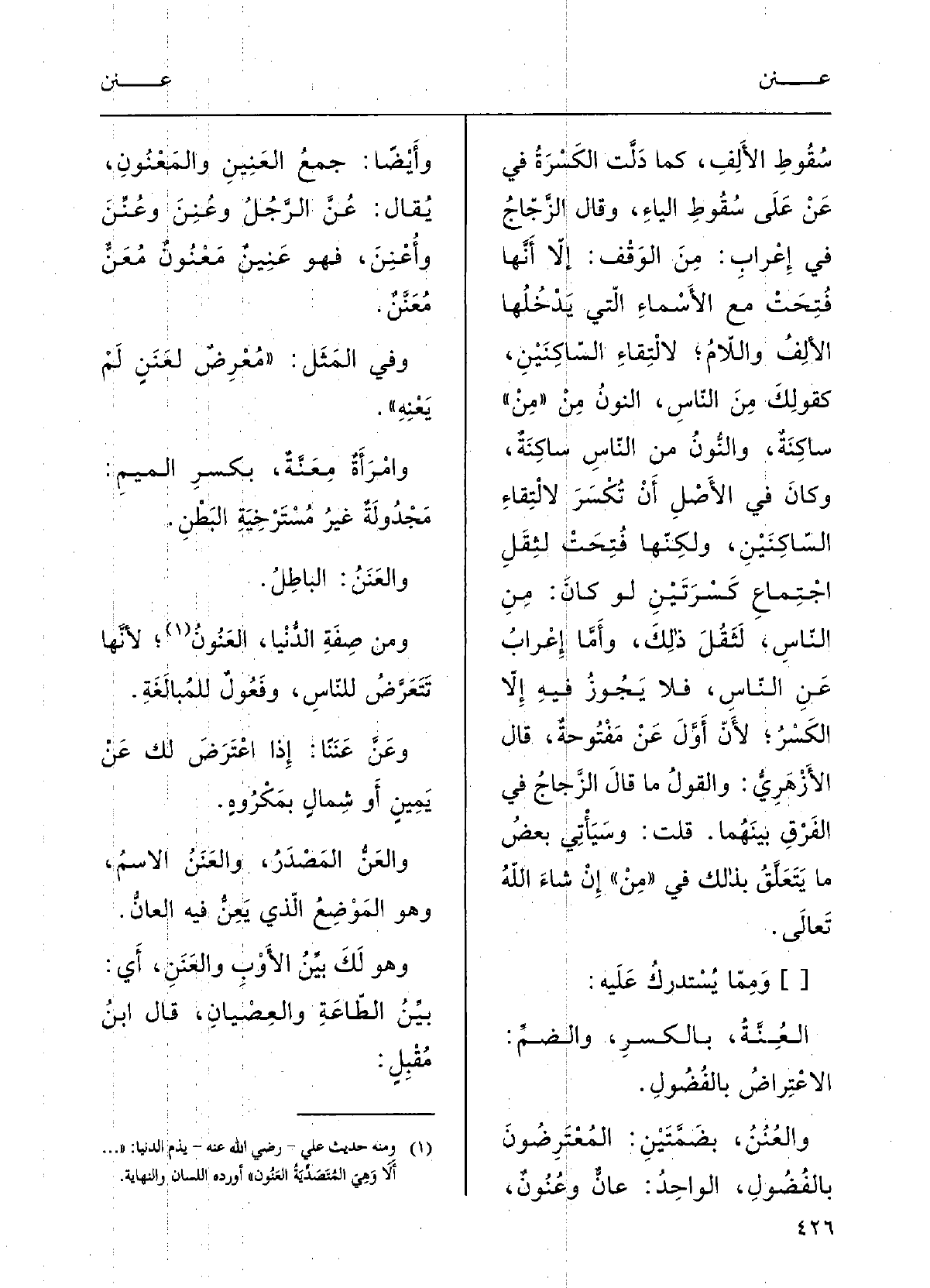 } والعُنُنُ، بضمَّتَيْن المُعْترِضُونَ بالفُضولِ، الواحِدُ {عانٌّ} وعَنُونٌ وأَيْضاً جَمْعُ {العَنِين} والمَعْنون.