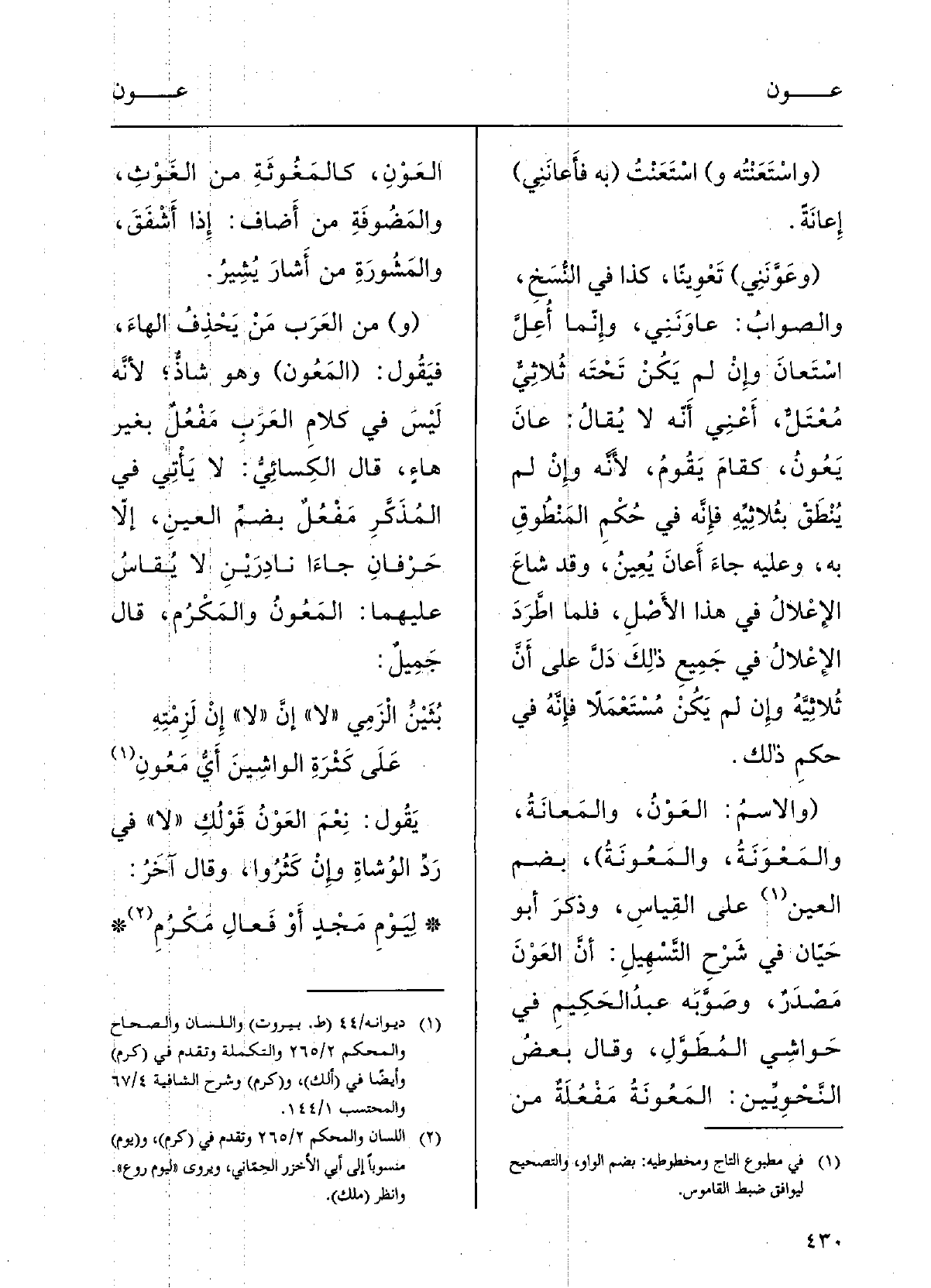 ( {واسْتَعَنْتُه و) } اسْتَعَنْتُ (بِهِ {فأَعانَنِي) إعانَةً (} وعَوَّنَنِي) {تَعْويناً، كَذَا فِي النُّسخِ، والصَّوابُ:} عاوَنَنِي، وإِنَّما أُعِلَّ اسْتَعانَ وإنْ لم يكنْ تحْتَه ثلاثيٌّ مُعْتل، أَعْنِي أَنَّه لَا يُقالُ {عانَ} يَعُونُ كَقَامَ يَقُومُ لأنَّه وَإِن لم يُنْطَق بثُلاثِيِّه، فإنَّه فِي حكْمِ المَنْطوق بِهِ، وَعَلِيهِ جاءَ {أَعانَ} يُعِين، وَقد شاعَ اَلإعْلالُ فِي هَذَا الأصْلِ، فلمّا اطّرد الإِعْلالُ فِي جمِيعِ ذَلِك دَلَّ على أَنَّ ثُلاثِيَّه وَإِن لم يكنْ مُسْتَعْملاً فإنّه فِي حكْمِ ذلِكَ، (والاسمُ {العَوْنُ} والمَعانَةُ {والمَعْوَنَةُ} والمَعُوْنَةُ) ، بضمِّ الواوِ على القِياسِ، وذَكَرَ أَبو حيَّان فِي شرْحِ التَّسْهيل أنَّ العونَ مَصْدَرٌ، وصَوَّبَه عبدُ الحكِيمِ فِي حواشِي المطول. وقالَ بعضُ النّحوِيّين: {المَعُونَةُ مَفْعُلة مِن العَوْن كالمَغُوثَة مِن الغَوْثِ، والمَضُوفَة مِن أَضافَ إِذا أَشْفَق، والمَشْورَة مِن أَشارَ يُشِير، (و) مِن العَرَبِ مَنْ يحْذِفُ الهاءَ فيقولُ (} المَعُونُ) ، وَهُوَ شاذٌّ لأنَّه ليسَ فِي كَلامِ العَرَبِ مَفْعُل بغيرِ هاءٍ.
