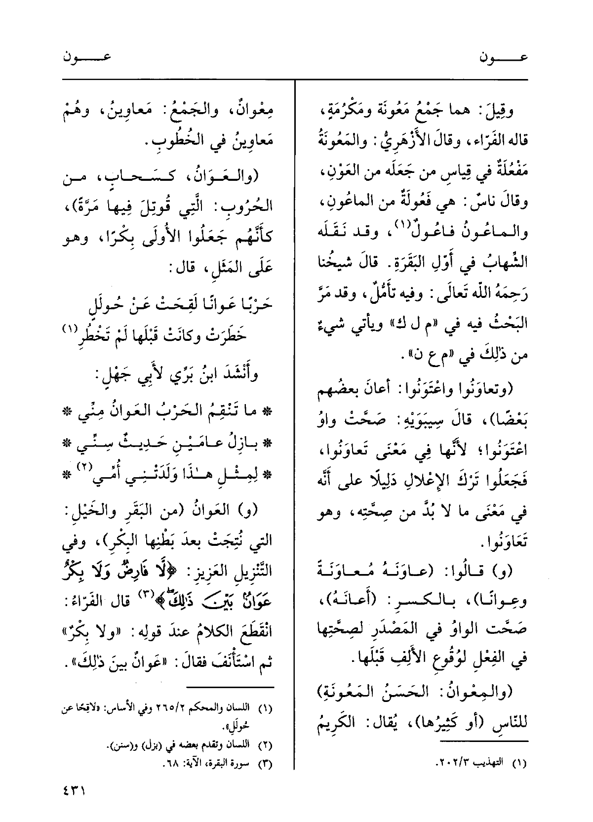وقالَ الأزْهرِيُّ:} والمَعُونة مَفْعُلة فِي قِياسِ مَنْ جَعَلَه مِن العَوْنِ.