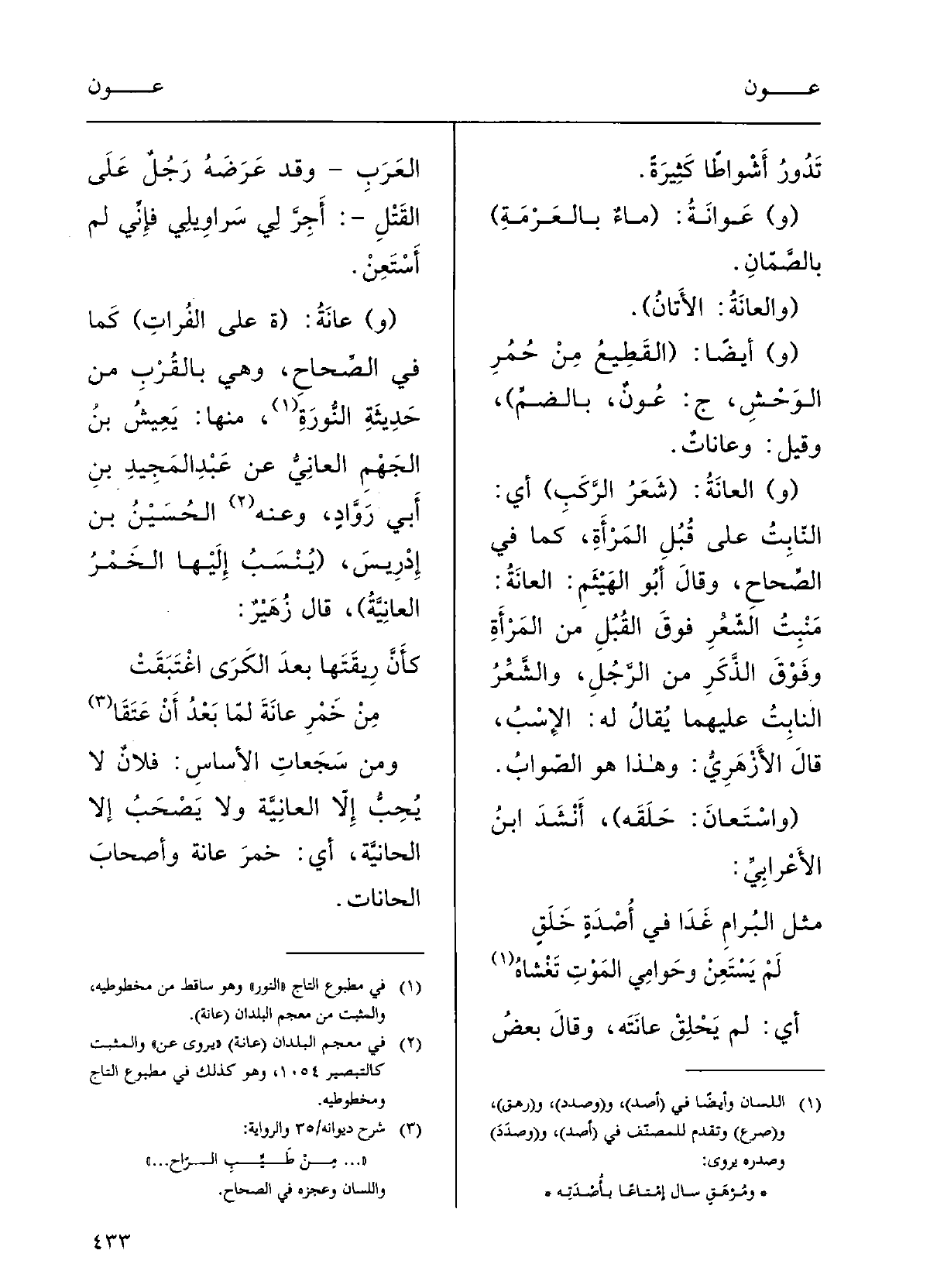 كأَنَّ رِيقَتَها بعد الكَرَى اغْتَبَقَتْ من خَمْرِ {عانَةَ لمَّا يَعْدُ أَن عَتَقاومِن سَجَعاتِ الأساس: فلانٌ لَا يُحبُّ إلاَّ} العانِيَّة وَلَا يَصْحَب إلاَّ الحانِيَّة، أَي خَمْرُ! عانَةَ وأَصْحاب الحَانَات.