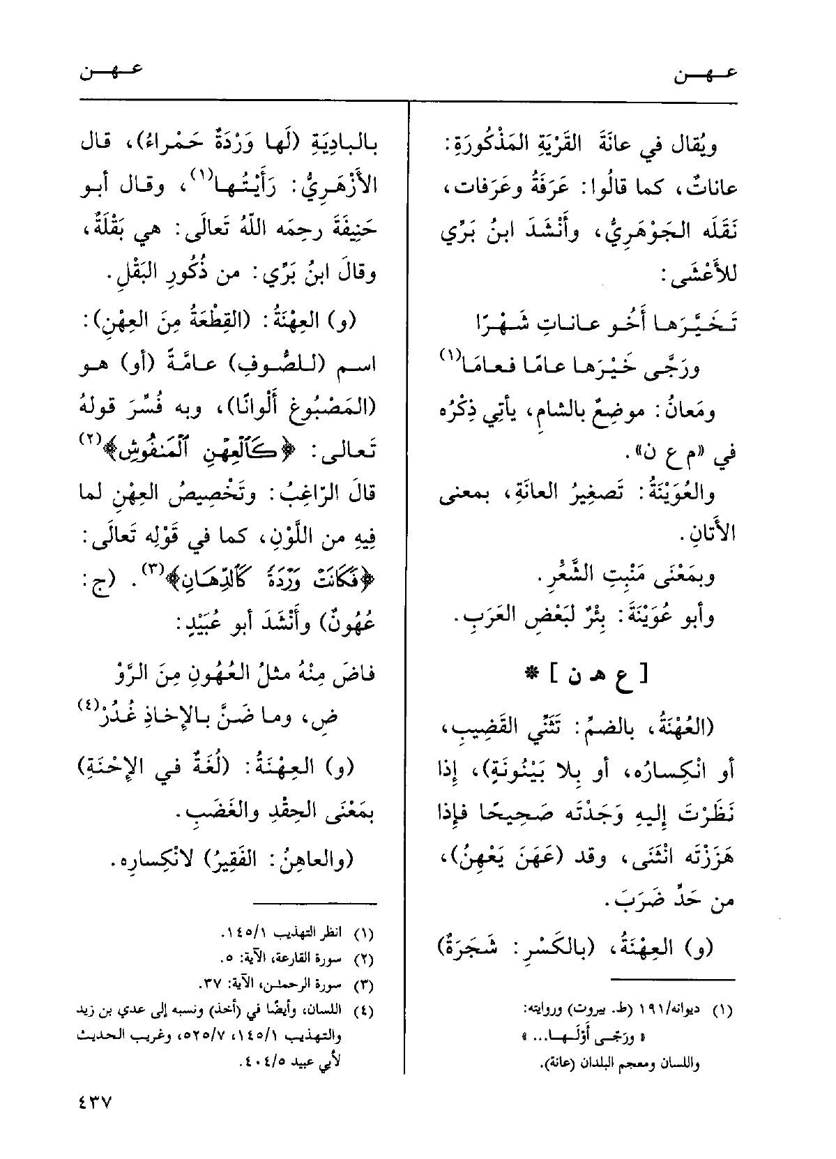 قالَ الرَّاغبُ: وَتَخْصِيص العِهْن لمَا فِيهِ مِن اللّوْن كَمَا فِي قوْلِه تَعَالَى: {فكانتْ وَرْدَة كالدِّهان} ؛ (ج عُهُونٌ) ؛ وأَنْشَدَ أَبو عُبَيْدٍ:
