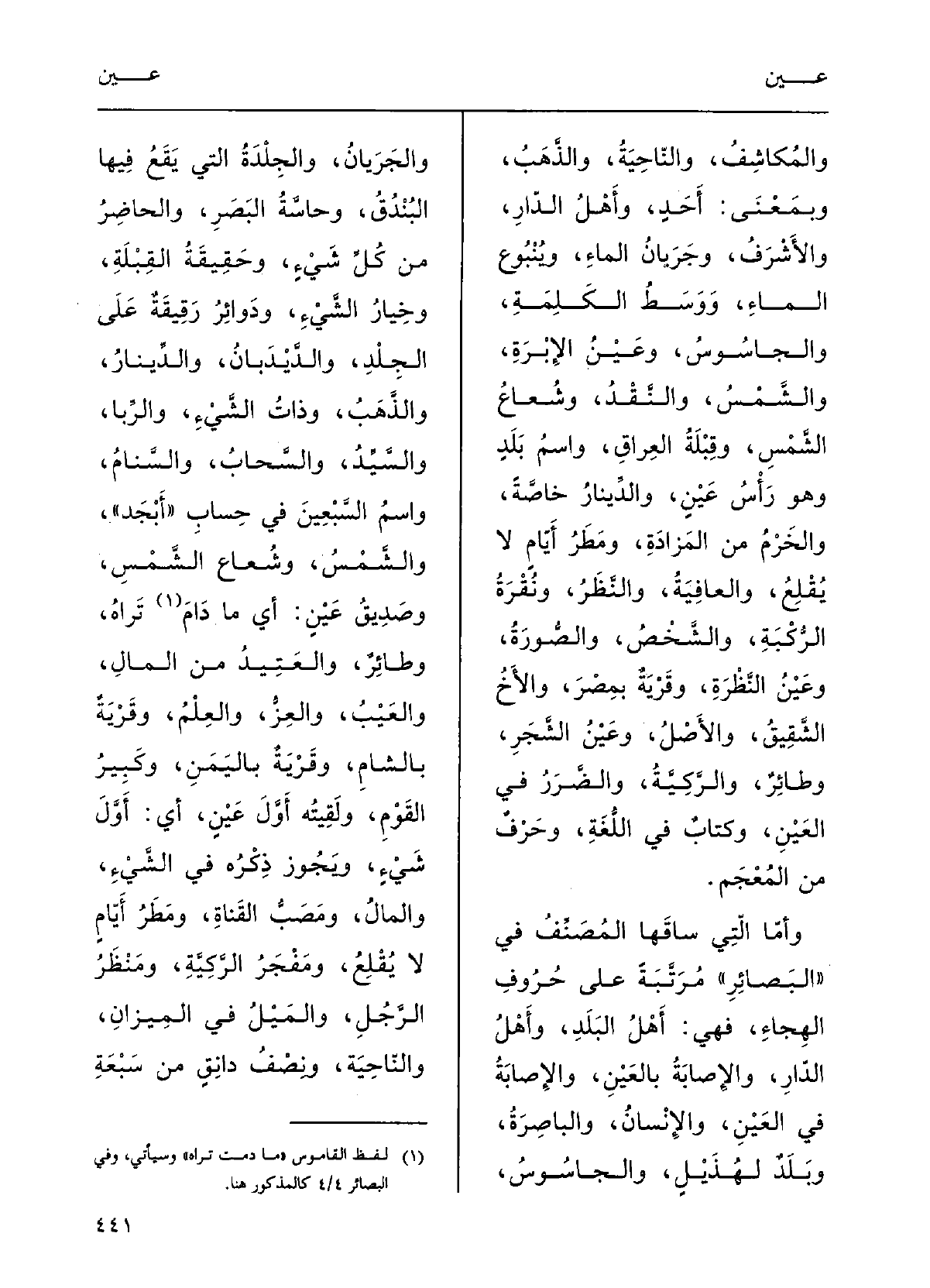 وأَمَّا الَّتِي ساقَها المصنِّفُ فِي البَصائِرِ مُرَتَّبَة على حُرُوفِ الهِجاءِ فَهِيَ: أَهْلُ البَلَدِ، وأَهْلُ الدَّارِ، والإصابَةُ! بالعَيْنِ، والإِصابَةُ فِي العَيْنِ، والإِنْسانُ، والباصِرَةُ، وبلدٌ لهُذَيْل، والجَاسُوسُ، والجَريانُ، والجلْدَةُ الَّتِي يَقَعُ فِيهَا البنْدَقُ، وحاسَّةُ البَصَرِ، والحاضِرُ مِن كلِّ شيءٍ، وحَقيقَةُ القبْلَةِ، وخيارُ الشيءِ، ودَوائِرُ رَقِيقَة على الجلْدِ، والدَّيْدَبان، والدِّينارُ، والذّهَبُ، وذاتُ الشيءِ، والرِّبا، والسيِّدُ، والسَّحابُ، والسَّنامُ، واسمُ السَّبعين فِي حسابِ أَبْجد، والشَّمْسِ، وشُعاعُ الشَّمْس، وصديقُ عَيْن أَي مَا دامَ ترَاهُ، وطائِرٌ، والعَتِيدُ مِن المالِ، والعَيْبُ، والعِزُّ، والعلمُ، وقَرْيةٌ بالشامِ، وقرْيَةٌ باليمنِ، وكبيرُ القوْمِ. ولَقِيْتُه أَوّل عَيْن: أَي أَوّل شيءٍ؛ وبجوزُ ذِكْرُه فِي الشيءِ والمالِ؛ ومصبُّ القناةِ، ومَطَرُ أَيّامٍ لَا يقلعُ، ومفجرُ الرّكية، ومنظرُ الرَّجل، والميلُ فِي المِيزانِ، والناحِيَةُ، ونصفُ دانِقٍ مِن سَبْعةِ