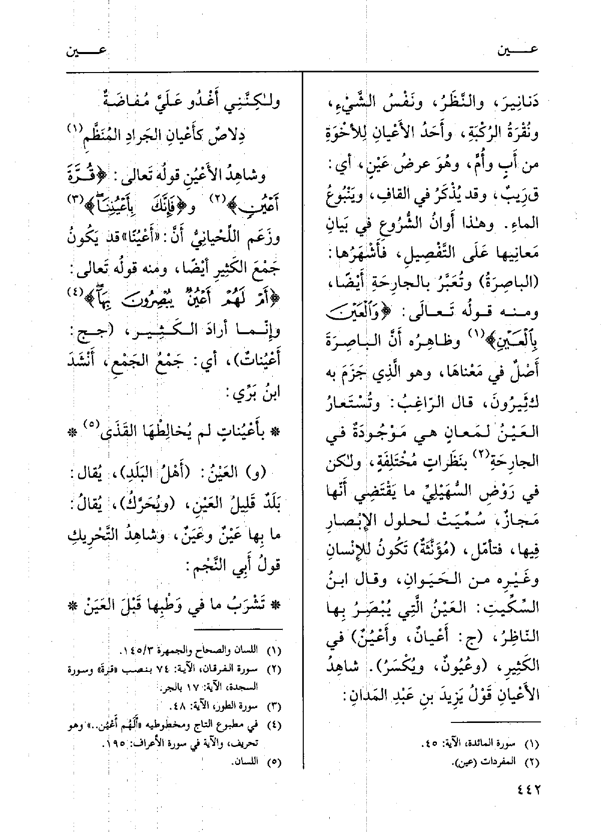 ولكِنَّني أَغْدُو عَليَّ مُفاضَةٌ دِلاصٌ {كأَعْيانِ الْجَرَاد المُنظَّمِ وشاهِدُ} الأَعْيُن قوْلهُ تعالَى: {قُرَّة أعين} و {فَإنَّك {بأعيننا} .