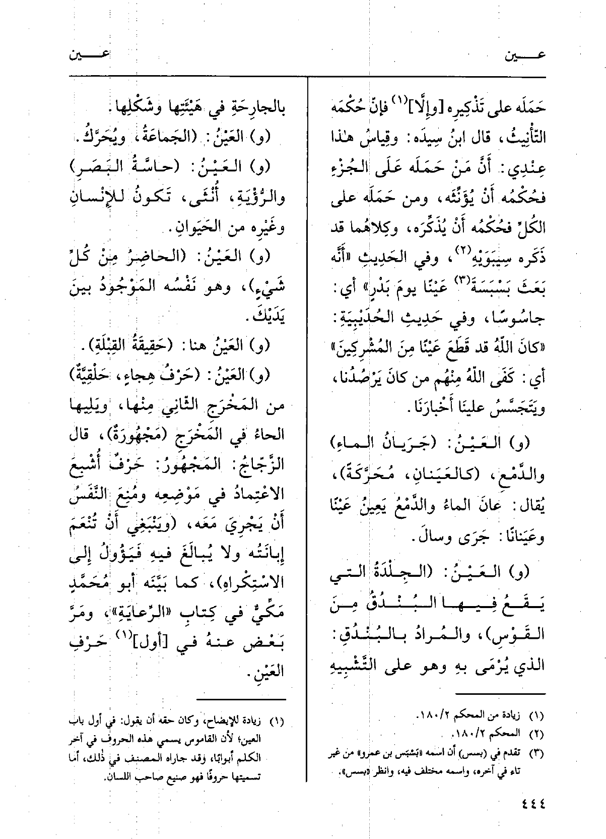 (و) العَيْنُ: (الجَماعَةُ؛ ويُحَرَّكُ) والعَيْنُ: (حاسَّةُ البَصَرِ) والرُّؤْيَةِ، أُنْثى تكونُ للإِنسانِ وغيرِهِ مِنَ الحَيوانِ.