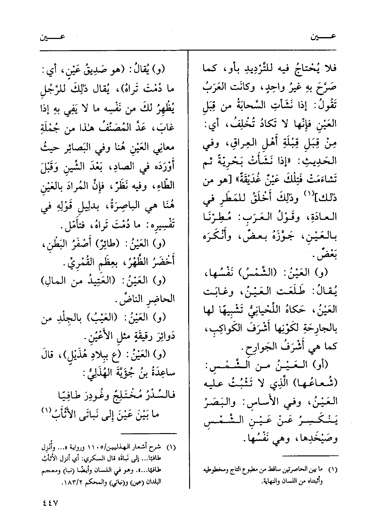 عَدَّ المصنِّفُ هَذَا مِن جملَةِ مَعَاني العَيْنِ هُنَا وَفِي البَصائِرِ حيثُ أَوْرَدَه فِي الصَّاد بعد الشِّين وقَبْل الطَّاء، وَفِيه نَظَرٌ فإنَّ المُرادَ بالعَيْنِ هُنَا هِيَ الباصِرَةُ بدَليلِ قوْلِه فِي تفْسِيرِه مَا دُمْتَ تَراهُ، فتأَمَّل.