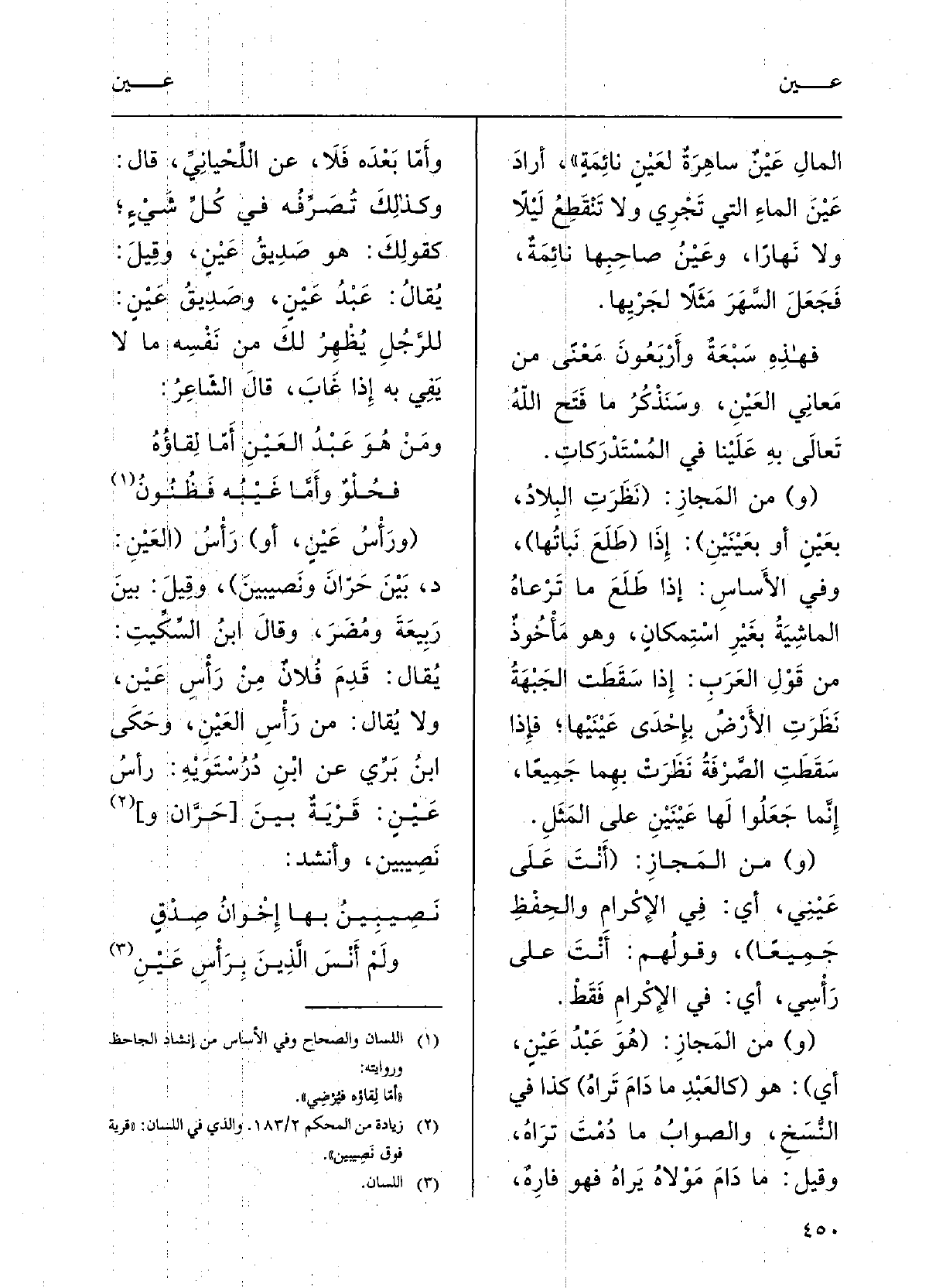 ومَنْ هُوَ عبْدُ} العَينِ أما لِقاؤُه فَحُلْوٌ وأَمَّا غَيْبُه فظَنُونُ (ورأْسُ عَيْنٍ، أَو) رأْسُ (العَيْنِ: د بَين حَرَّانَ ونَصِيبينَ) ؛ وقيلَ: بينَ ربيعَةَ ومُضَر.