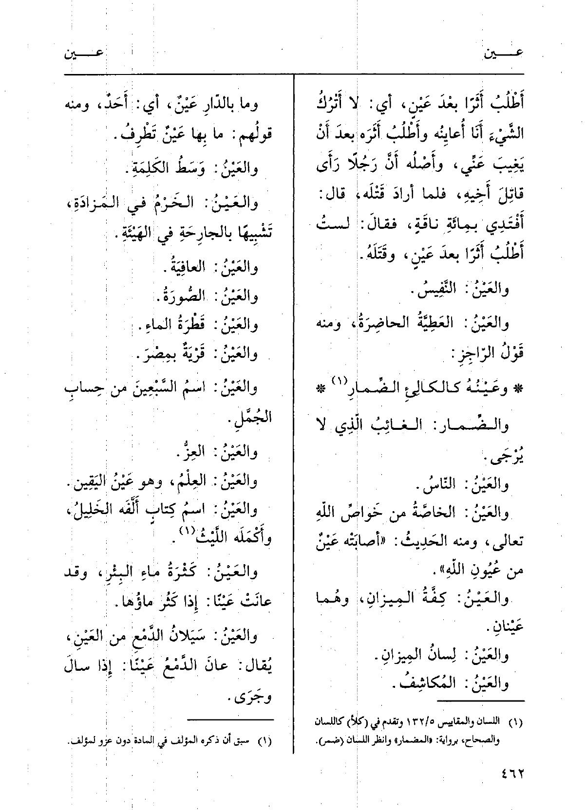 والعَيْنُ: اسمُ كتابٍ ألَّفَهُ الخَلِيلُ وأَكْمَلَهُ اللَّيْثُ.