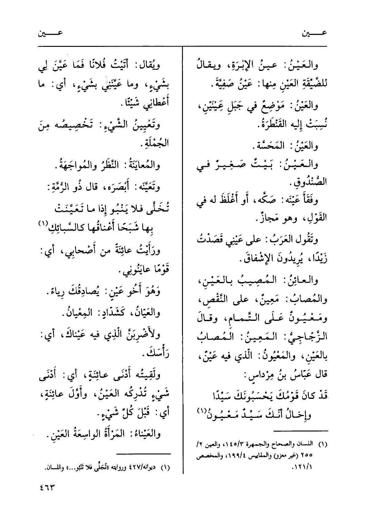 والعَيْنُ: موْضِعٌ فِي جَبَلِ عَيْنَيْن نُسِبَتْ إِلَيْهِ القَنْطَرَةُ.