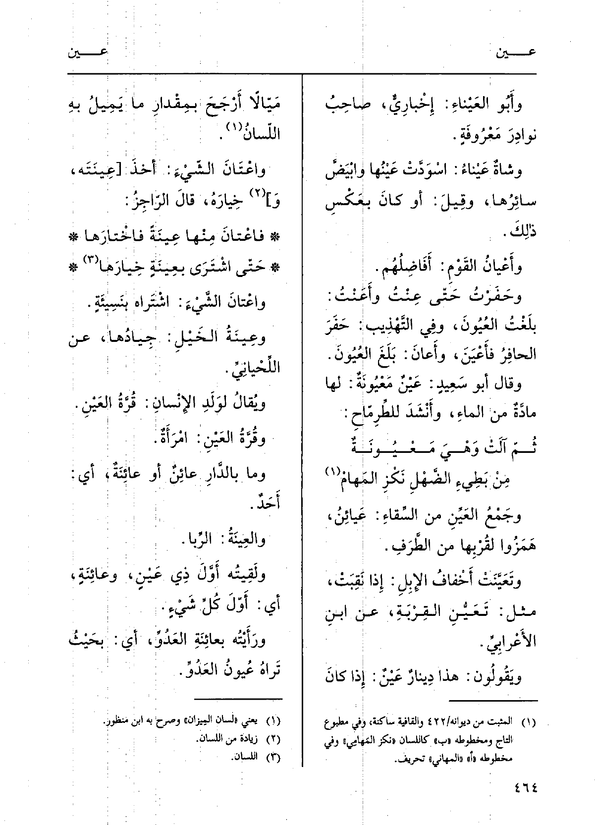 ثمَّ آلَتْ وَهِي مَعْيُونَةٌ من بَطِيءِ الضَّهْلِ نُكْزِ المَهام ِوجَمْعُ العَيْنِ مِن السِّقاءِ: {عَيَائِنُ؛ هَمَزُوا لقُرْ بِها مِن الطَّرَفِ.