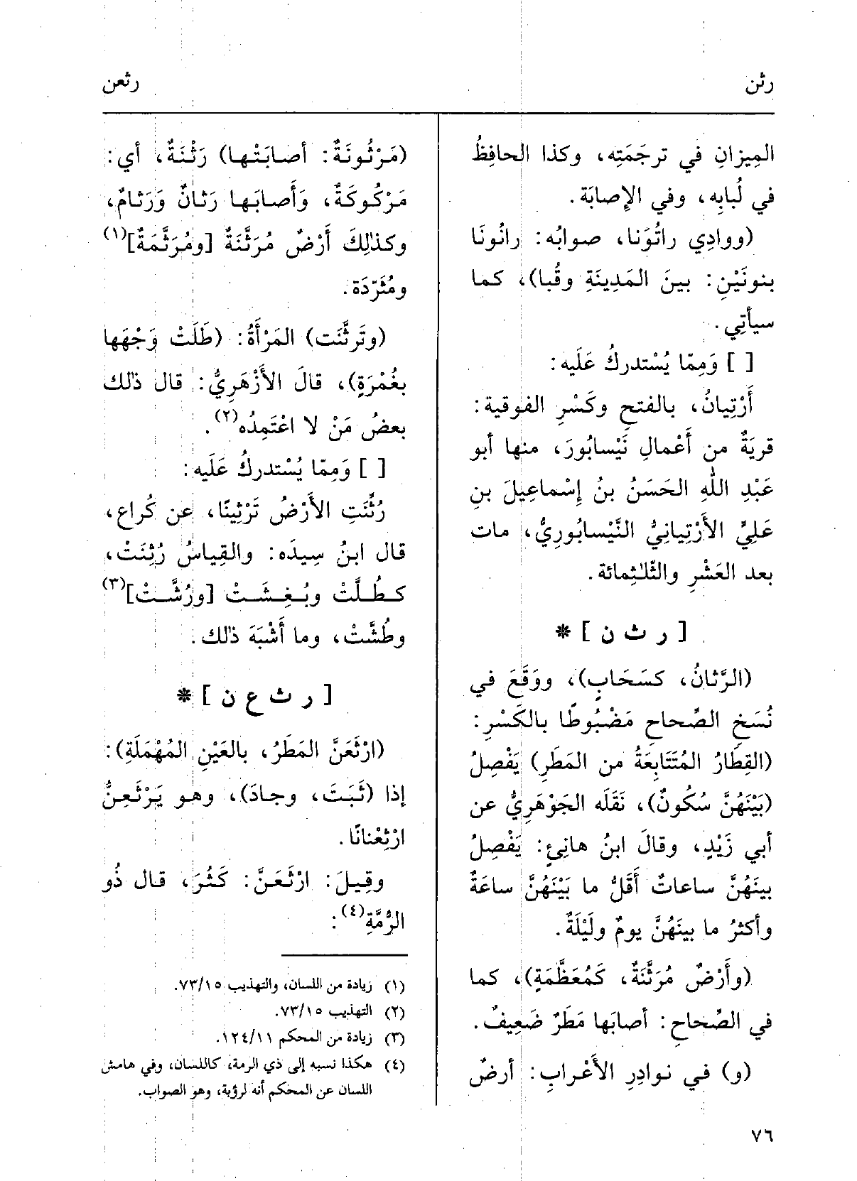 (و) فِي نوداِرِ الأَعْرابِ: أَرْضٌ (مَرْثونَةٌ: أَصابَتْها) رَثْنَةٌ، أَي مَرْكُوكَة، أَصابَها رَثَانٌ ورَثَامٌ، وكَذلِكَ أَرْضٌ مُرَثَّنَةٌ ومُثَرَّدَةٌ.