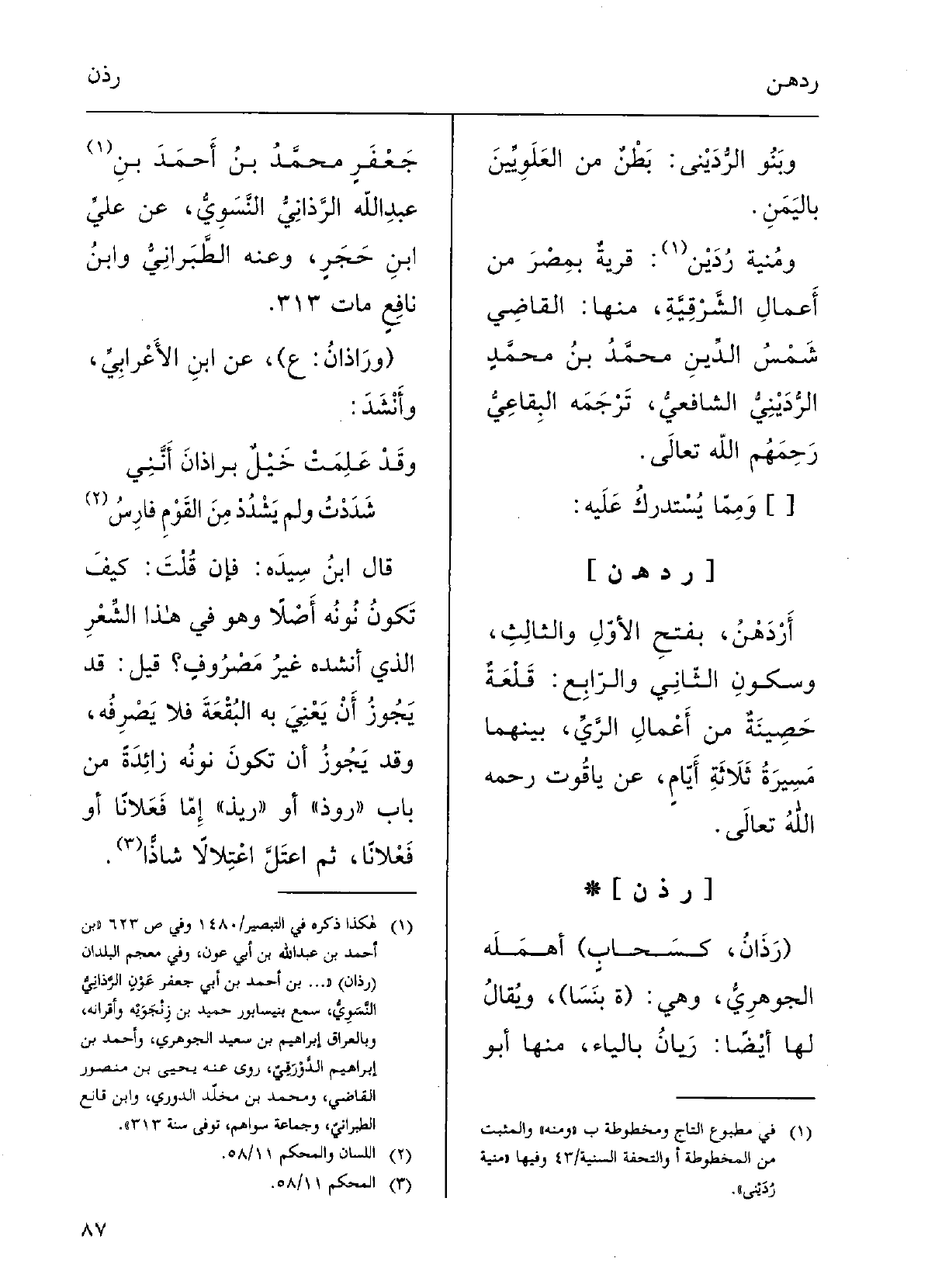 وَقد عَلِمَتْ خيلٌ بِرَاذانَ أَنَّنيشَدَدْتُ وَلم يَشْدُدْ من القومِ فارِسُقالَ ابنُ سِيْدَه: فَإِن قلْتَ كيفَ تكونُ نُونُه أَصْلاً وَهُوَ فِي هَذَا الشّعْر الَّذِي أَنْشَدَه غَيْر مَصْرُوفٍ؟ قيلَ: قد يَجوزُ أنْ يُعْنَى بِهِ البُقْعَةُ فَلَا يَصْرِفُه، وَقد يَجوزُ أَنْ تكونَ نُونُه زائِدَةً مِن بَاب رعاذ إمَّا فَعَلاناً أَو فَعْلاناً، ثمَّ اعْتلَّ اعْتِلالاً شَاذّاً.