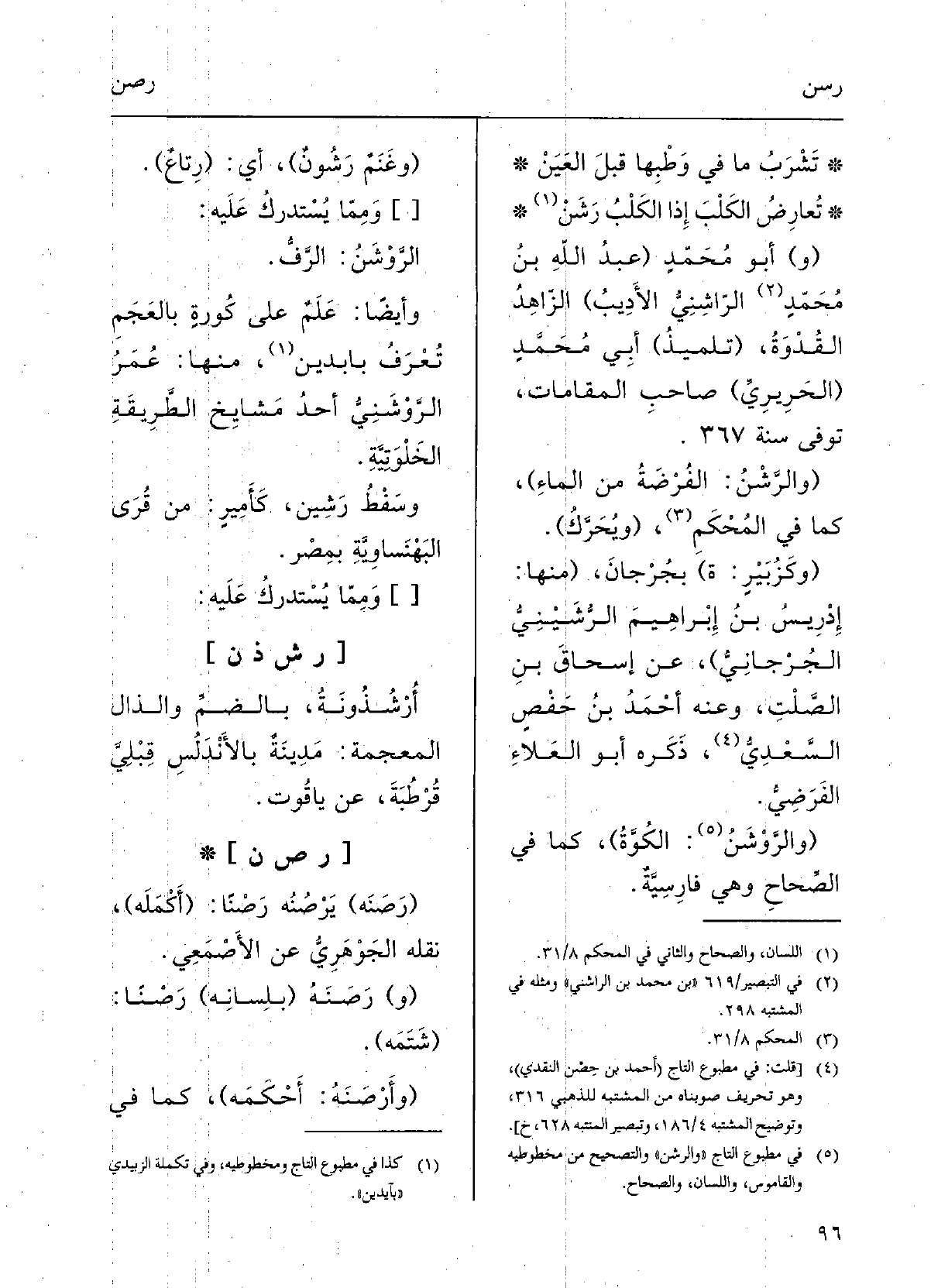 تَشْرَبُ مَا فِي وَطْبِها قَبْلَ العَيَنْتُعارِضُ الكلبَ إِذا الكلبُ رَشَنْ (و) أَبو محمدٍ (عبدُ اللهاِ بنُ مُحمدٍ الراشِنِيُّ الأَدِيبُ) الزَّاهدُ القُدْرَةُ (تِلميذُ) أَبي محمدٍ (الحَرِيريِّ) صاحِبِ المَقامَاتِ، (توفّي سنة 367) .