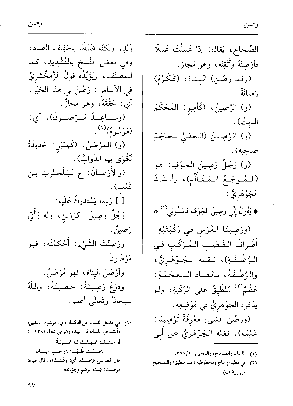 الصِّحاحِ يقالُ عَملْتَ عَمَلاً فأَرْصنْه وأَتْقِنْه وَهُوَ مجازٌ (وَقد رَصُنَ البناءُ ككَرُمَ رَصانَةً والرَّصِينُ (كأَميرٍ: المُحْكَمُ الثَّابِتُ.