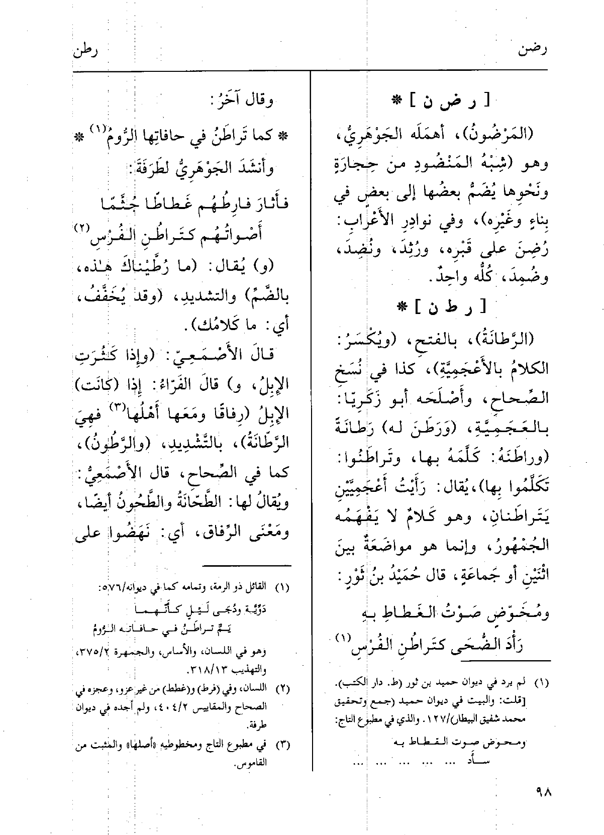 : (الرَّطانَةُ) ، بالفتْحِ (ويُكْسَرُ: الكَلامُ بالأَعْجَمِيَّةِ) ، كَذَا فِي نسخِ الصِّحاحِ، وأصْلَحه أَبو زكرِيَّا بالعُجْمِيَّة.