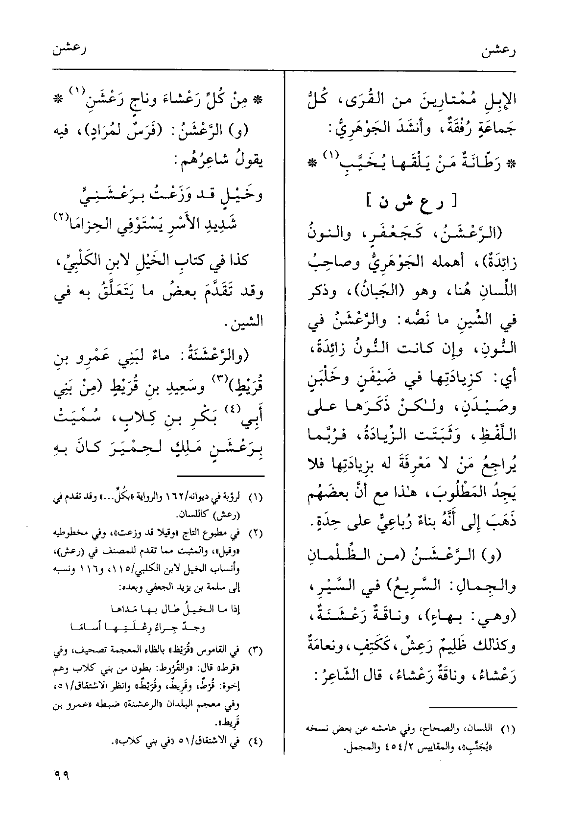 وَهُوَ (الجَبانُ) . وذُكِرَ فِي الشّين مَا نَصّه: والرَّعْشَنُ فِي النّونِ وَإِن كانتِ النونُ زائِدَةً، أَي كزِيادَتِها فِي ضَيْفَن وخَلْبَن وصَيْدَن، وَلَكِن ذَكَرَها على اللَّفْظِ وثَبَتَتِ الزِّيادَةُ، فرُبَّما يراجعُ مَنْ لَا مَعْرِفَة لَهُ بزِيادَتِها فَلَا يجدُ المَطْلوبَ، هَذَا مَعَ أنَّ بعضَهم ذَهَبَ إِلَى أنَّه بناءٌ رباعِيٌّ على حدةٍ.