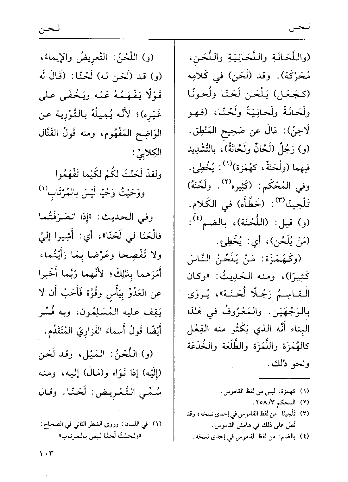 وَلَقَد لَحَنْتُ لكم لِكَيْما تَفْهَمُواووَحَيْتُ وَحْياً ليسَ بالمُرْتابِوفي الحدِيثِ: (إِذا انْصَرَفْتُما فالْحَنَا لي لَحْناً) ، أَي أَشِيرَا إليَّ وَلَا تُفْصِحا وعَرِّضا بِمَا رَأَيْتُما، أَمَرَهُما بذلِكَ لأنَّهما رُبَّما أَخْبرا عَن العَدُوِّ بيأْسٍ وقُوَّةٍ فأَحَبَّ أَنْ لَا يَقِفَ عَلَيْهِ المُسْلمُونَ؛ وَبِه فُسِّرَ أَيْضاً قَوْلُ أَسْماء الفَزَارِي المتقدِّمُ.