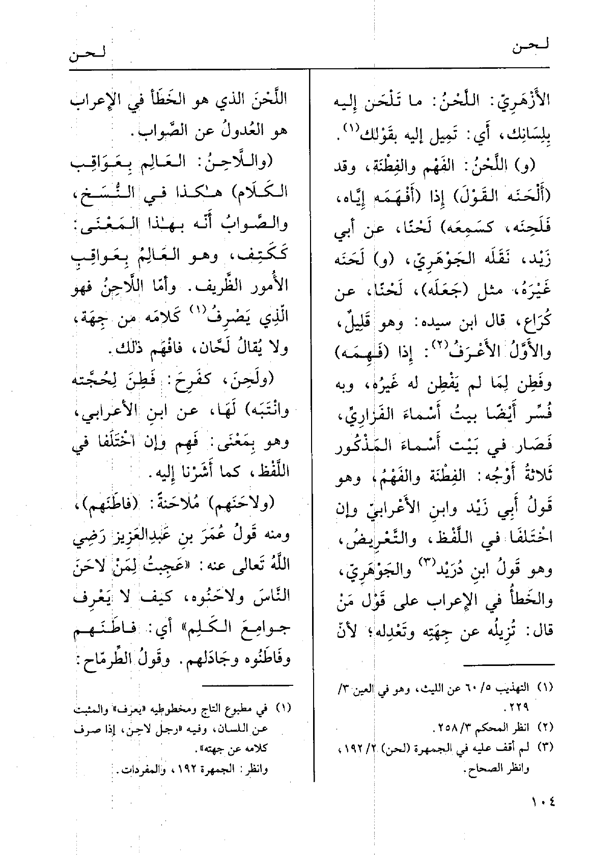الأزْهرِيُّ: اللَّحْنُ مَا تَلْحَنُ إِلَيْهِ بلِسانِك، أَي تَمِيلُ إِلَيْهِ بقَوْلِكَ.
