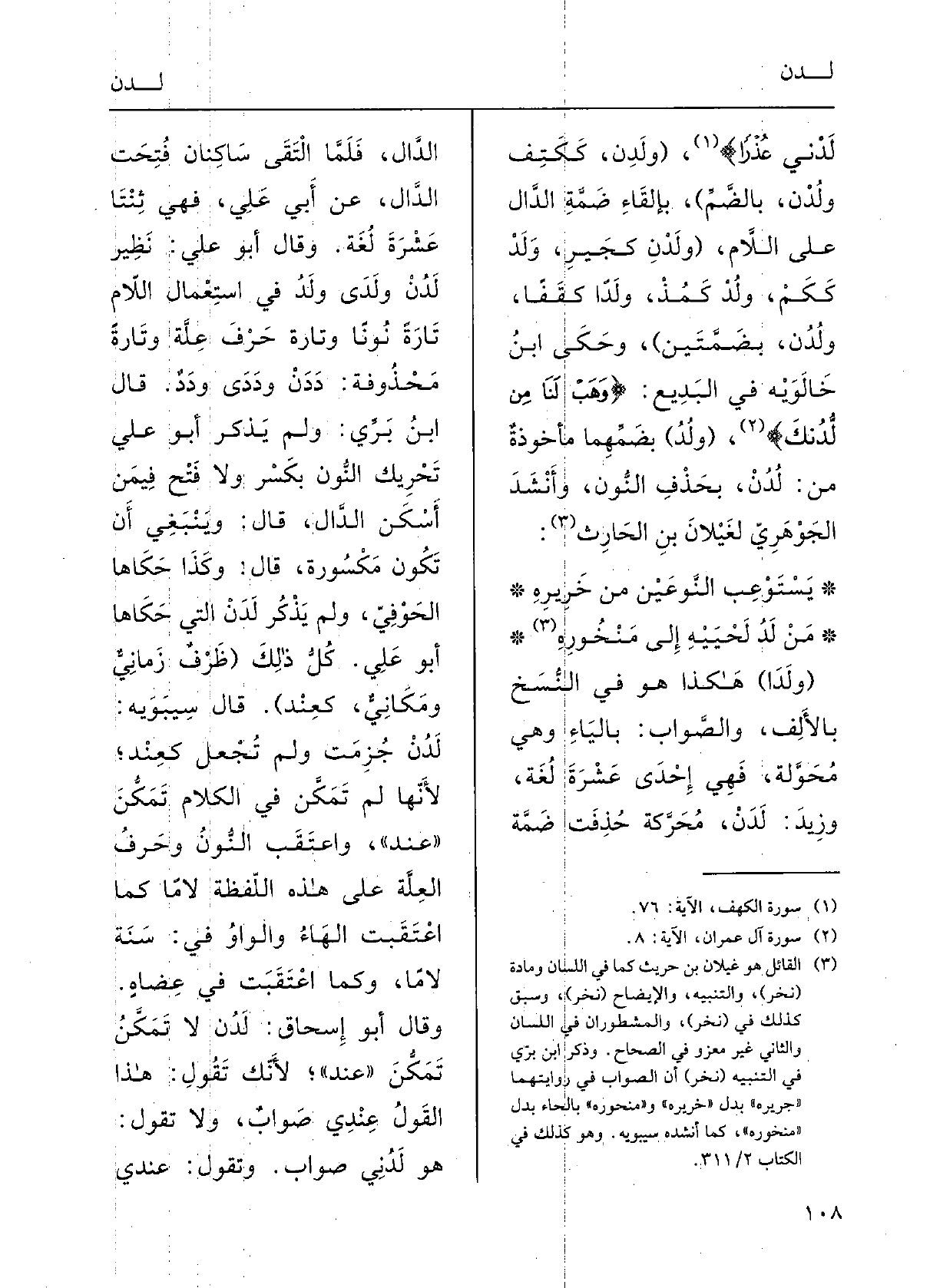 (قالَ سِيْبَوَيْه: لَدُنْ جُزِمَتْ وَلم تُجْعَل كعِنْدَ لأنَّها لم تَمَكَّنْ فِي الكَلامِ تَمَكُّن عِنْدَ، واعْتَقَبَ النونُ وحرفُ العِلَّةِ على هَذِه اللَّفظةِ لاماً، كَمَا اعْتَقَبَتِ الْهَاء والواوُ فِي سَنَةٍ لاماً، وكما اعْتَقَبَتْ فِي عِضاهٍ.