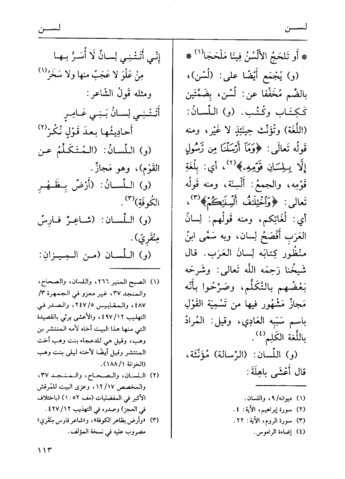 أَو تَلْحَجُ الألْسُن فِينَا مَلْحَجا (و) يُجْمَعُ أَيْضاً على (لُسْنٍ) ، بالضمِّ مُخفَّفاً عَن لُسُنٍ بضمَّتَيْن ككِتابٍ وكُتُبٍ.
