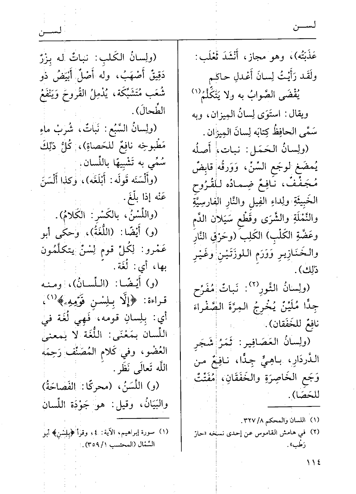 (و) أَيْضاً: (اللِّسانُ) ؛) وَمِنْه قِراءَةٌ: {إلاَّ بلِسْنِ قوْمِه} ، أَي بلِسان قَوْمِه، فَهِيَ لُغَةٌ فِي اللِّسانِ بمعْنَى اللُّغَةِ لَا بمعْنَى الْعُضْو فِي كَلامِ المصنِّفِ، رحِمَه اللَّهُ تَعَالَى نَظَرٌ.
