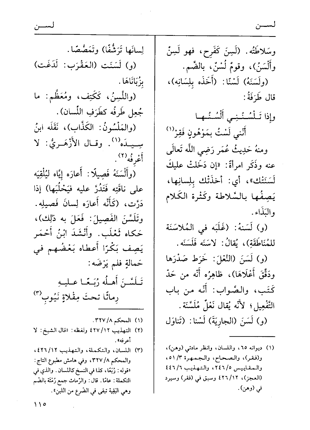 وَإِذا تَلْسُنُني أَلْسُنُهاإنني لستُ بموْهُونٍ فَقِرْومنه حدِيثُ عُمَر، رضِيَ اللَّهُ تَعَالَى عَنهُ، وذكَرَ امْرأَةً: (إِن دَخَلَتْ عَلَيْك لَسَنتْكَ) ، أَي أَخَذَتْكَ بلِسانِها، يَصِفُها بالسَّلاطَةِ وكثْرَةِ الكَلامِ والبَذَاء.
