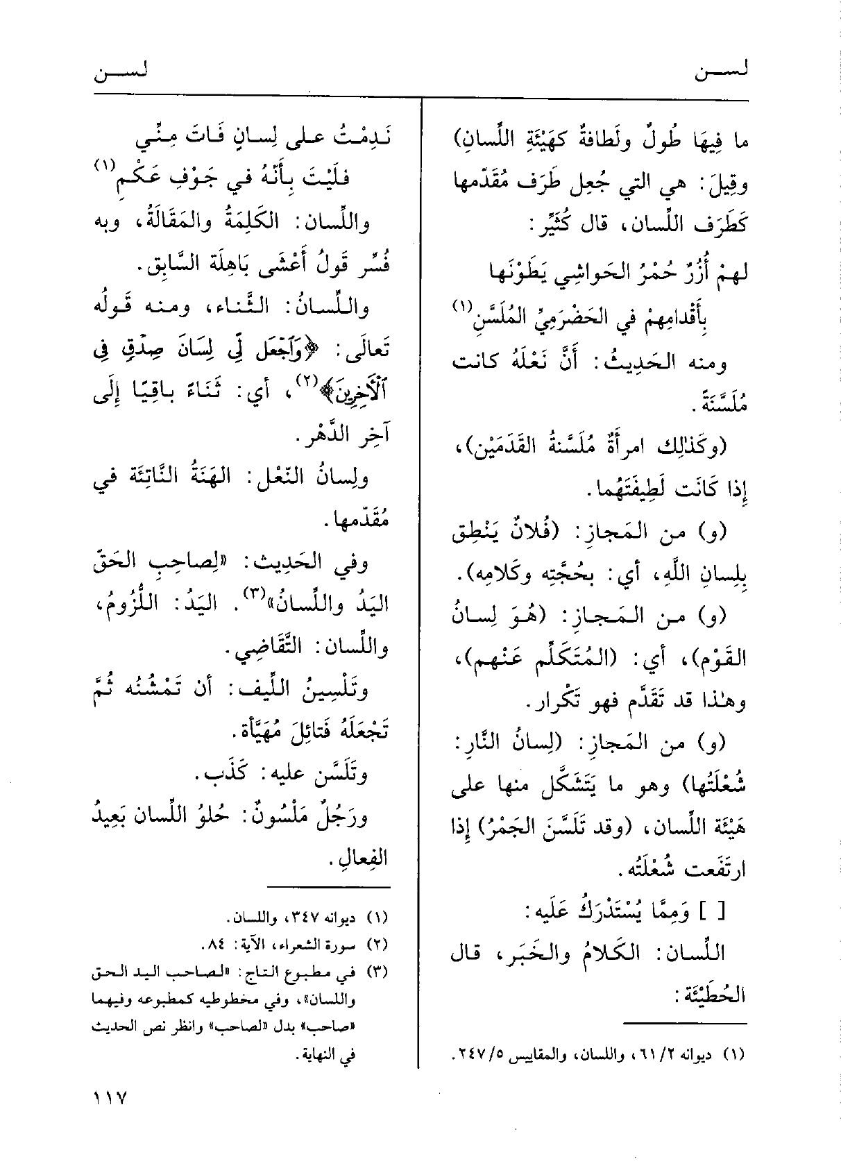اللِّسانُ: الكَلامُ والخَبَرُ؛ قالَ الحُطَيْئة: