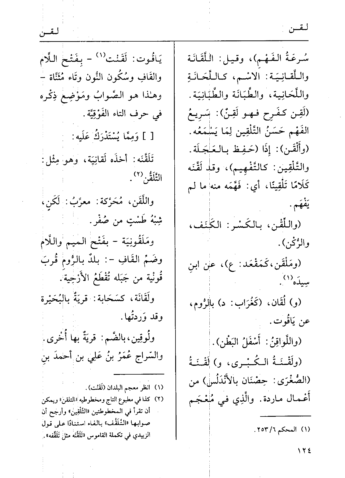 وَالَّذِي فِي مُعْجَمِ ياقوت: لَقَنْت، بفتْحِ اللامِ والقافِ وسكونِ النونِ وتاء مُثناة، وَهَذَا هُوَ الصَّوابُ، ومَوْضِع ذِكْرِه فِي حَرْفِ التاءِ الفَوْقِيَّة.