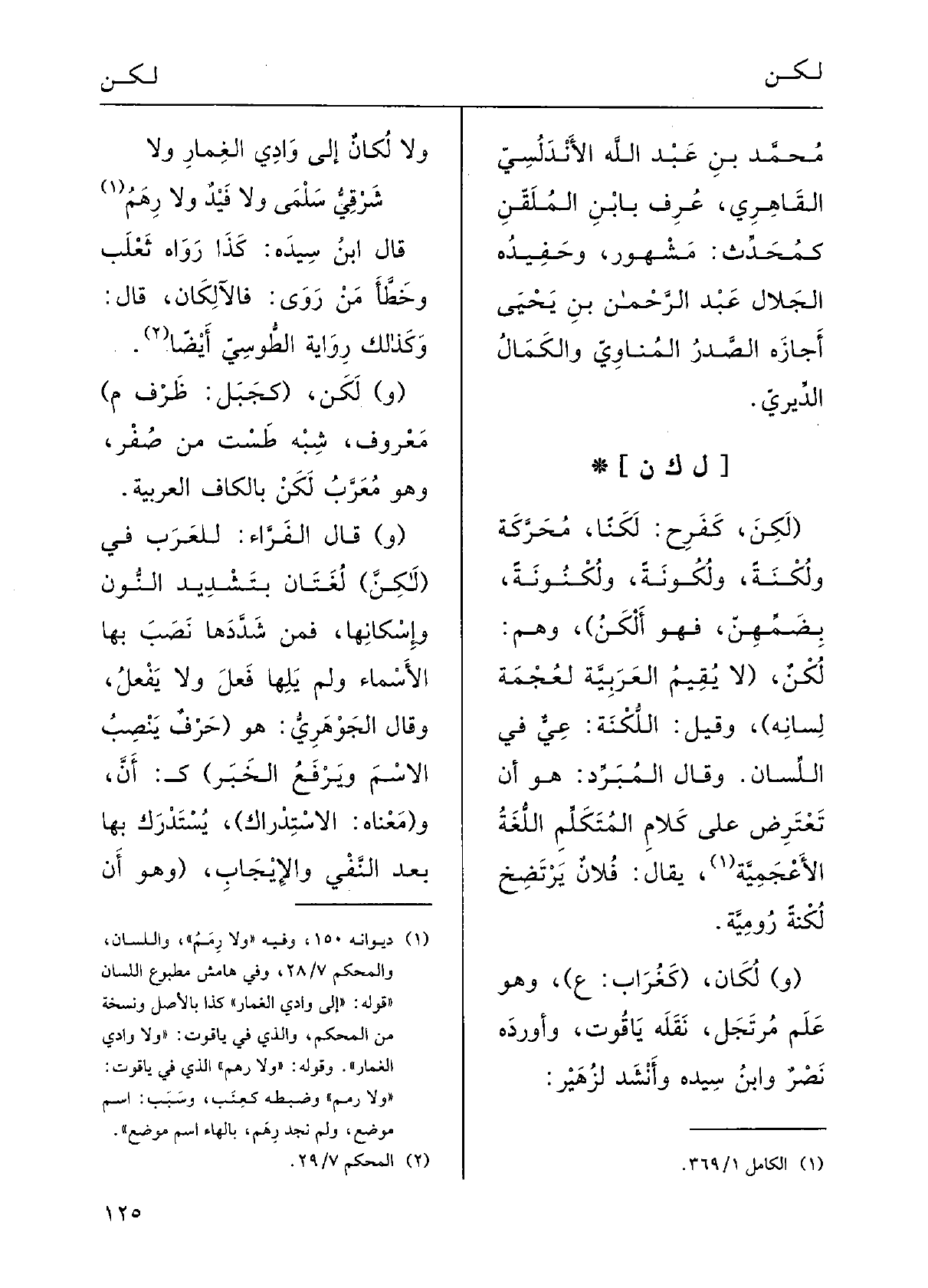 وَلَا لُكانٌ إِلَى وادِي الغِمارِ ولاشَرْقيُّ سَلْمى وَلَا فيْدٌ وَلَا رِهَمُقالَ ابنُ سِيدَه: كَذَا رَوَاهُ ثَعْلب، خطَّأَ مَنْ رَوَى فالآلُكانُ، قالَ: وكَذلكَ رِوايَةُ الطُّوسيّ أَيْضاً.