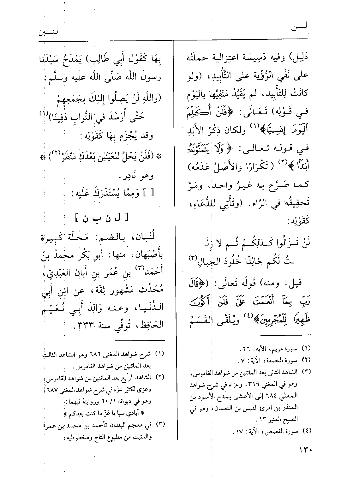 :) لُنبَانُ، بالضمِّ: مَحَلَّةٌ كبيرَةٌ بأَصْبَهانَ، مِنْهَا: أَبو بكْرٍ محمدُ بنُ أَحمدَ بنِ عُمَرَ بنِ أَبان العَبْديُّ مُحَدِّثٌ مَشْهورٌ ثِقَةٌ عَن ابنِ أَبي الدُّنْيا، وَعنهُ والِدُ أَبي نعيمٍ الحَافِظُ، تُوفي سَنَة 332.