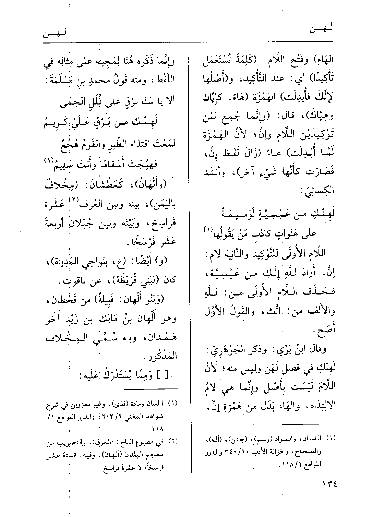 أَلا يَا سَنى بَرْقٍ على قُلَلِ الحِمَى لَهِنَّك من بَرْقٍ عَلَيَّ كَريمُلَمَعْتَ اقْتِذاءَ الطَّيرِ والقوْمُ هُجَّعٌ فهَيَّجْتَ أسْقاماً وأَنتَ سَلِيمُ (وأَلْهانٌ) ، كعَطْشانٍ: (مِخْلافٌ باليَمَنِ) بَيْنه وبينَ العرن عَشرَةَ فراسِخَ، وبَيْنه وبينَ جبلان أَرْبَعة عَشَرَ فَرْسخاً.