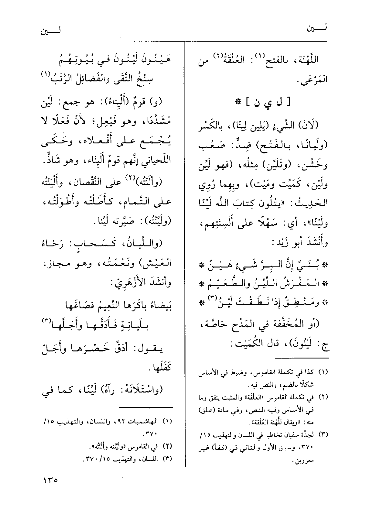 : ( {لانَ) الشَّيءُ (} يَلِينُ {لِيناً) ، بالكسْرِ (} ولَياناً، بالفتْحِ) ، ضِدُّ صَعُبَ وخَشُنَ، ( {وتَلَيَّنَ) مِثْلُه، (فَهُوَ} لَيِّنٌ {ولَيْنٌ، كمَيِّتٍ ومَيْتٍ) ؛) وَبِهِمَا رُوِي الحدِيثُ: (يَتْلُونَ كتابَ اللَّهِ} لَيِّناً {ولَيْناً) ، أَي سَهْلاً على أَلْسِنَتِهم؛ وأَنْشَدَ أَبو زيْدٍ: