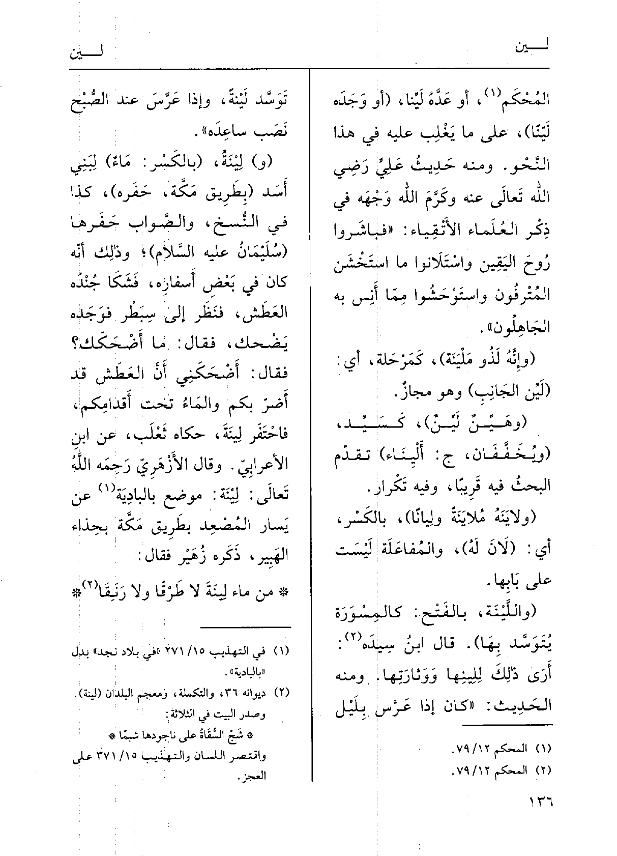 وقالَ الأزْهرِيُّ، رَحِمَه اللَّهُ تَعَالَى: لِينَةُ: مَوْضِعٌ بالبادِيَةِ عَن يَسارِ المُصْعِدِ بطريقِ مكةَ بحِذاءِ الهَبِير، ذَكَرَه زهيرٌ فقالَ: