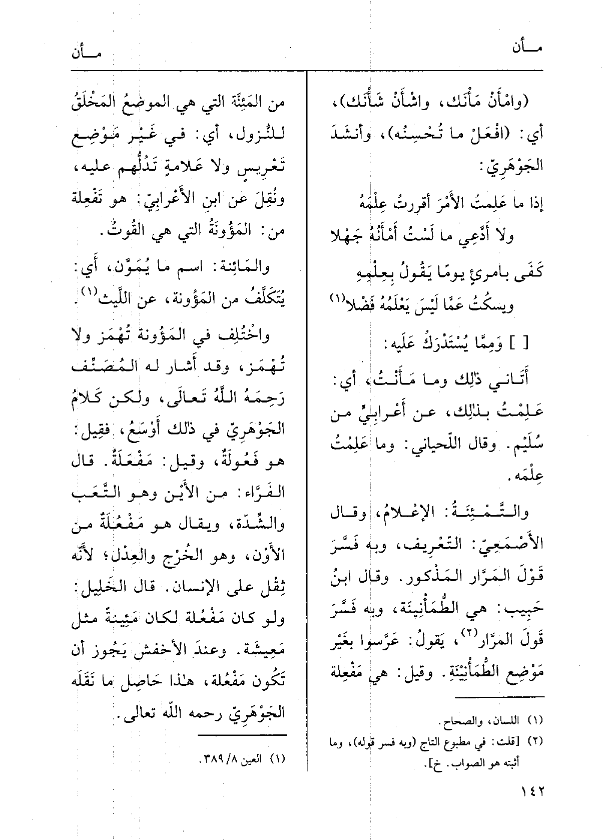 قالَ الخليلُ: وَلَو كانَ مَفْعُلة لكانَ مَئِينةً مِثْل مَعِيشةٍ؛ وعنْدَ الأَخْفَش يَجوزُ أَنْ تكونَ مَفْعُلة؛ هَذَا حاصِلُ مَا نَقَلَه الجوْهرِيُّ رحِمَه اللَّهُ تَعَالَى.