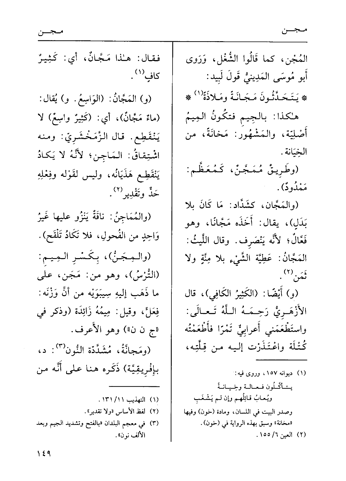 وقالَ الليْثُ: المَجَّانُ: عطيةُ الشيءِ بِلا مِنَّةٍ وَلَا ثَمَنٍ.