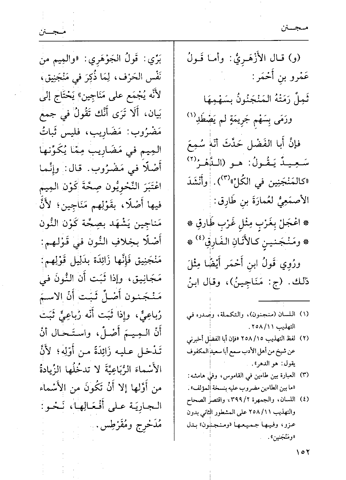 قالَ: وإنَّما اعْتَبَر النّحويُّونَ صحَّةَ كَوْنِ الميمِ فِيهَا أَصْلاً بقَوْلِهم مَناجِين، لأنَّ مَناجِينَ يَشْهدُ بصحَّةِ كَوْنِ النُّونِ أَصْلاً بخِلافِ النّونِ فِي قَوْلِهم مَنْجَنِيق فإنَّها زائِدَةٌ، بدَليلِ قَوْلِهم مَجانِيق، وَإِذا ثَبَتَ أنَّ النُّونَ فِي مَنْجَنُون أَصْلٌ ثَبَتَ أنَّ الاسمَ رُباعيٌّ، وَإِذا ثَبَتَ أنَّه رُباعيٌّ ثَبَتَ أنَّ المِيمَ أَصْلٌ، واسْتَحالَ أَنْ تَدْخلَ عَلَيْهِ زائِدَةً مِن أَوَّلِه، لأنَّ الأَسْماءَ الرّباعِيةَ لَا تَدْخلُها الزِّيادَةُ مِن أَوَّلِها، إلاَّ أَنْ تكونَ من الأَسْماءِ الجارِيَةِ على أَفْعالِها نَحْو مُدَحْرِج ومُقَرْطِس.