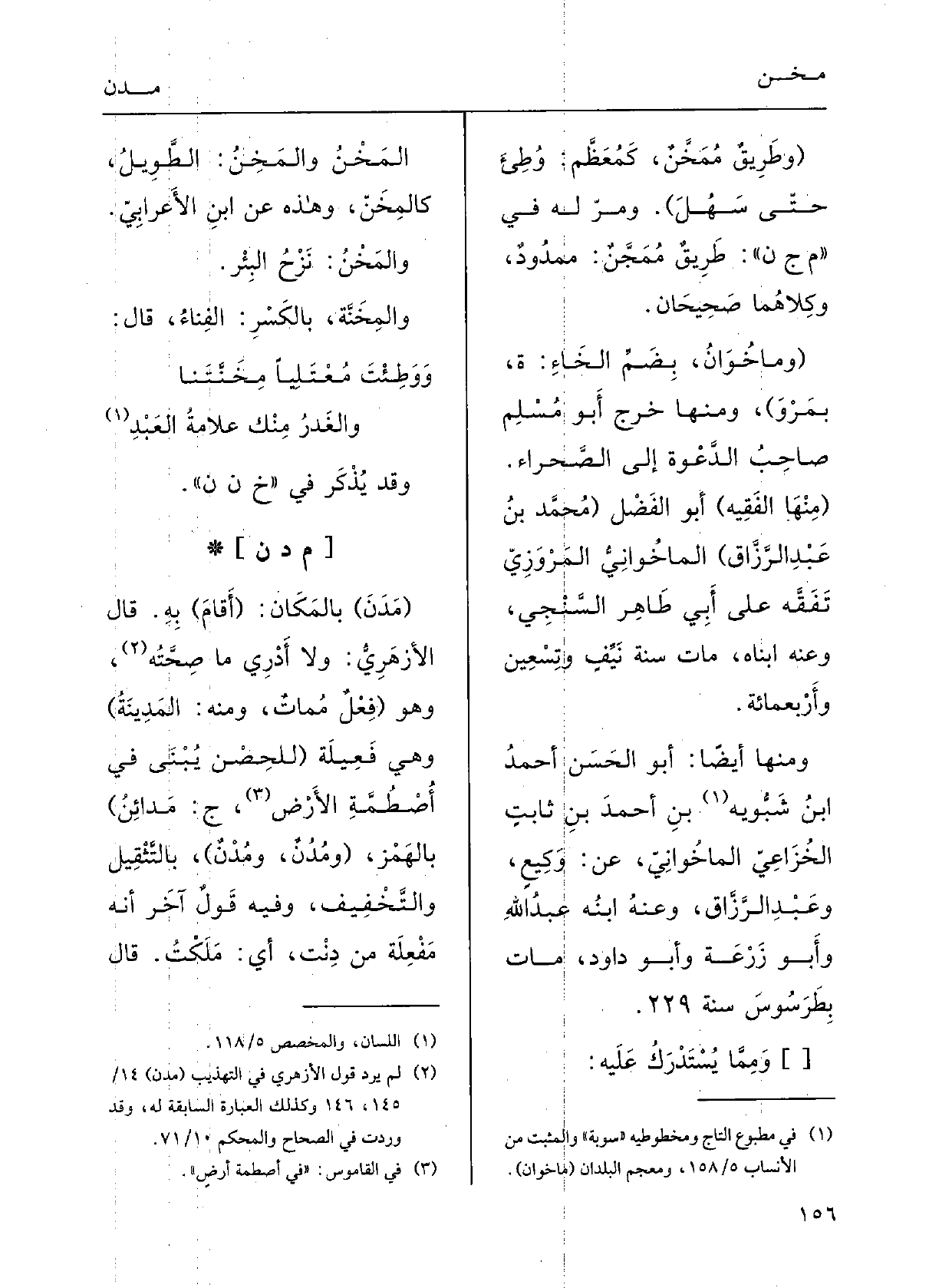 قالَ الأَزْهريُّ: وَلَا أَدْرِي مَا صحَّتُه وَهُوَ (فِعْلٌ مُمَاتٌ، وَمِنْه المَدينَةُ) ، وَهِي فَعِيلَةٌ، (للحِصْنِ يُبْنى فِي أُصْطُمَّةِ الأَرْضِ، ج مَدائِنُ) ، بالهَمْزِ، (ومُدُنٌ ومُدْنٌ) ، بالتَّثْقيلِ والتَّخْفِيفِ.