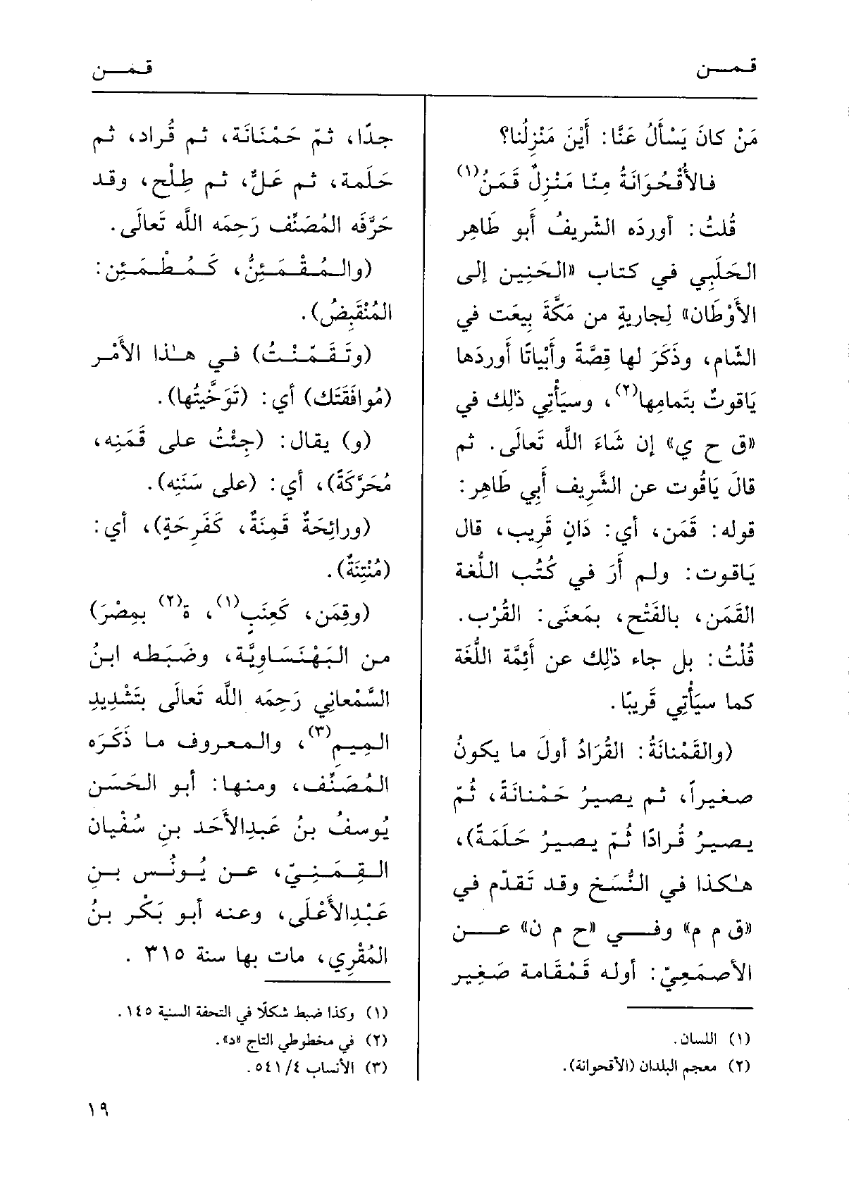 قالَ ياقوتُ: وَلم أَرَ فِي كُتُبِ اللغَةِ القَمْن بالفتْحِ بمعْنَى القُرْب.