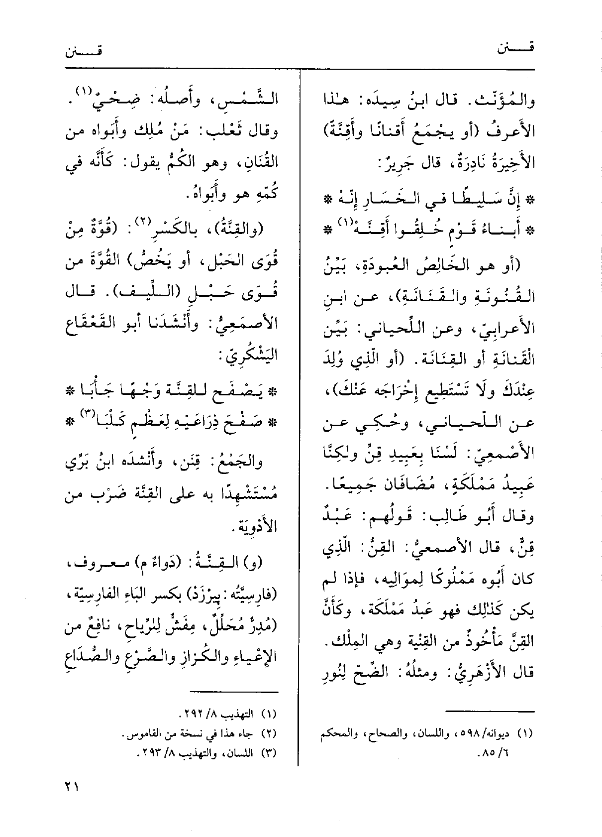 إنَّ سَلِيطاً فِي الخَسَارِ إِنَّهْأَبْناءُ قوْمٍ خُلِقُوا {أَقِنَّهْ (أَو هُوَ الخالِصُ العُبودَةِ بَيِّنُ} القُنُونَةِ {والقَنانَةِ؛ عَن ابنِ الأَعْرابيِّ؛ وَعَن اللّحْيانيِّ: بَيِّنُ} القَنانَةِ أَو {القِنَانَةِ.