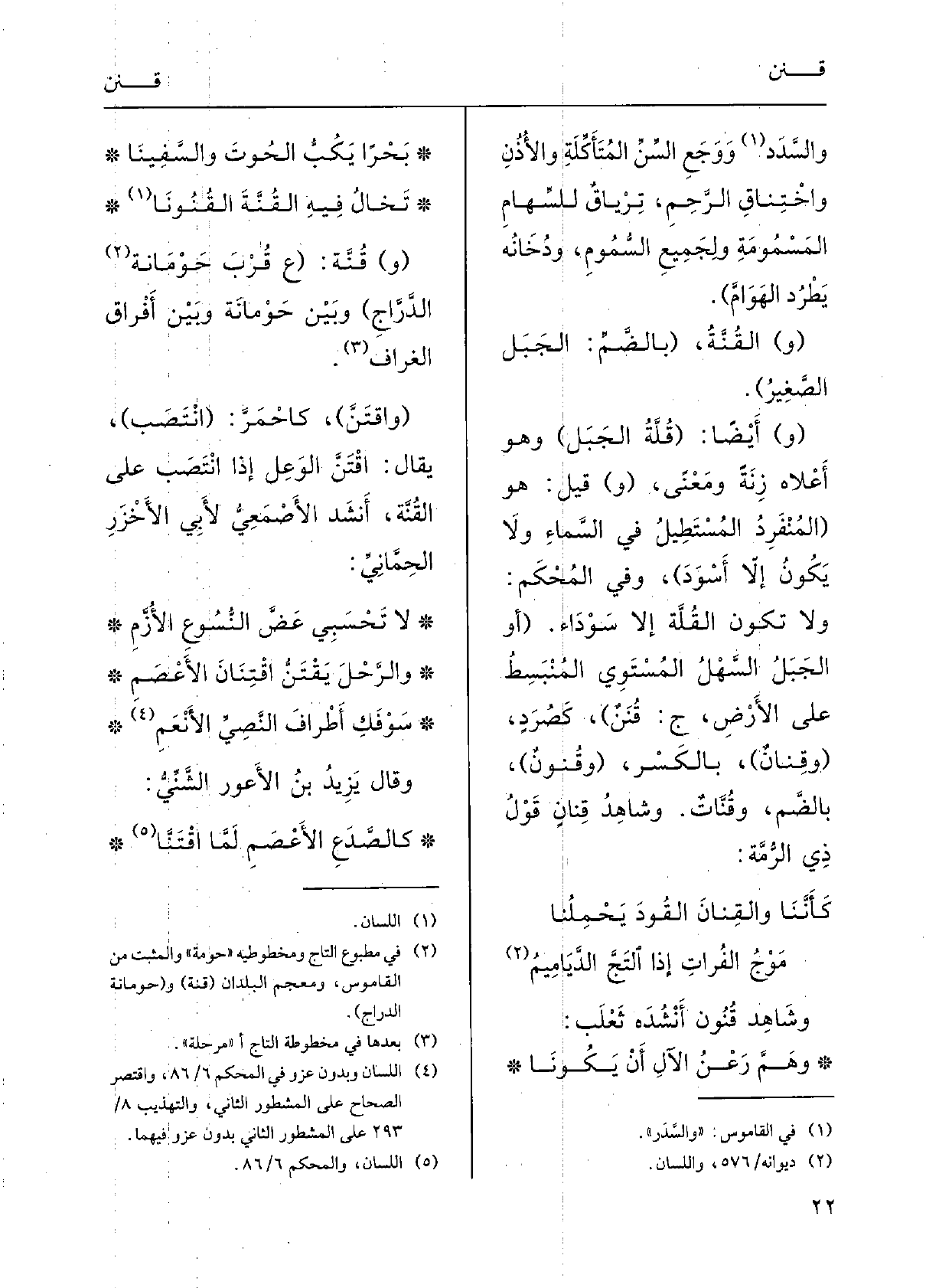وهَمَّ رَعْنُ الآلِ أَنْ يكونابَحْراً يَكُبُّ الحوتَ والسَّفِيناتَخالُ فِيهِ {القُنَّةَ} القُنُونا (و) {قُنَّةُ: (ع قُرْبَ جَوْمَةِ الدَّرَّاجِ وبينَ حَوْمانَة وبَيْنَ أَفْراق الغرَّاف.