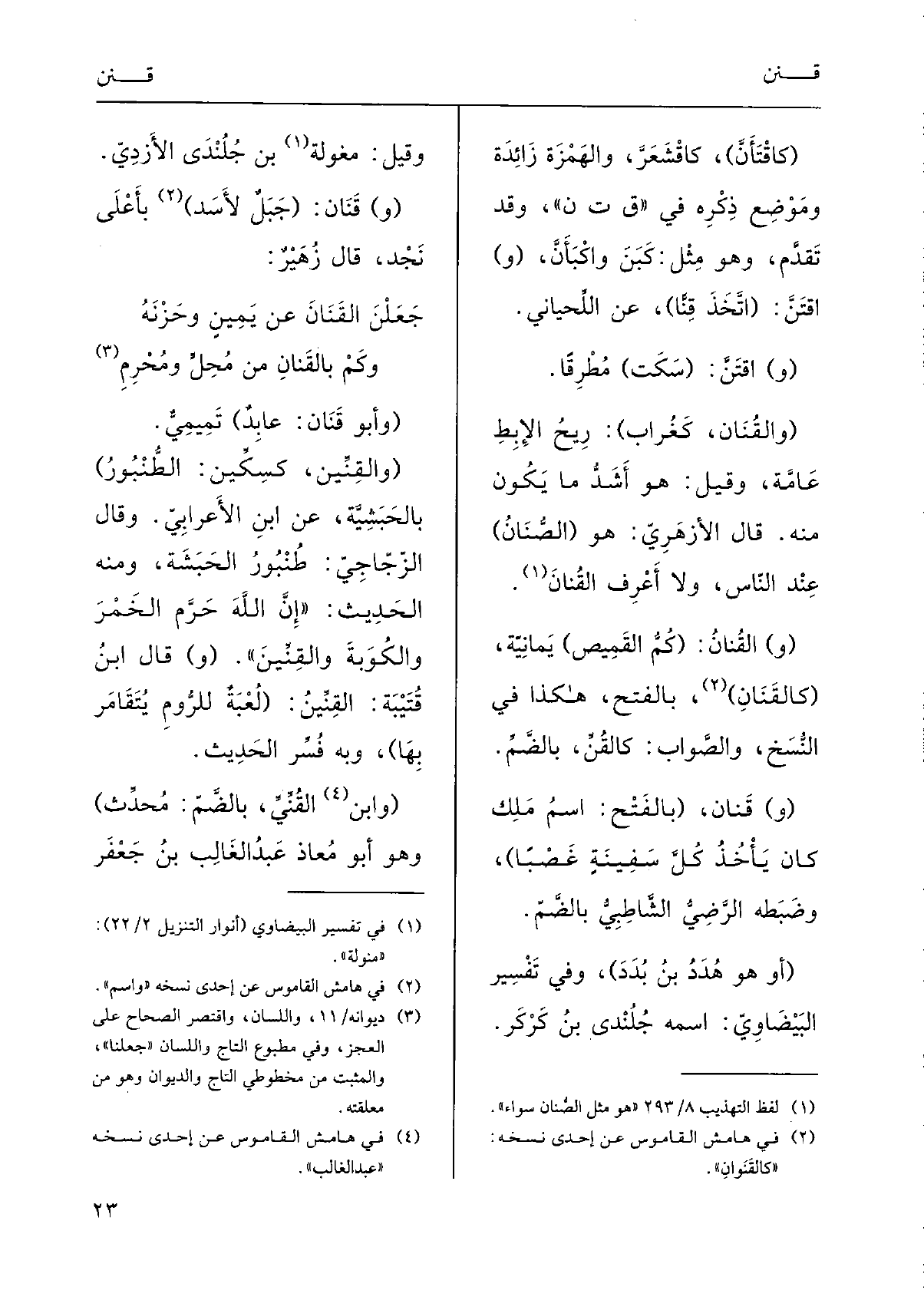 ((و) } القُنَانُ: (كُمُّ القَميصِ، يَمانِيَّةٌ، ( {كالقَنانِ، بالفتْحِ، هَكَذَا فِي النسخِ والصَّوابُ} كالقُنِّ بالضَّمِّ.
