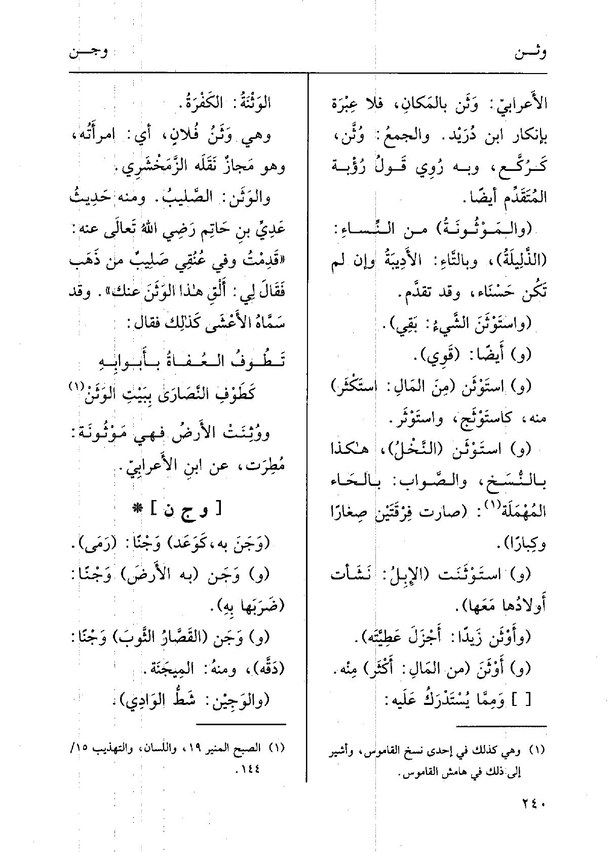 تَطُوفُ العُفاةُ بأَبْوابِهكطَوْفِ النَّصارَى ببَيْتِ الوَثَن ْ {ووُثِنَتِ الأرضُ فَهِيَ مَوْثُونَةٌ: مُطِرَتْ؛ عَن ابنِ الأَعْرابيِّ.