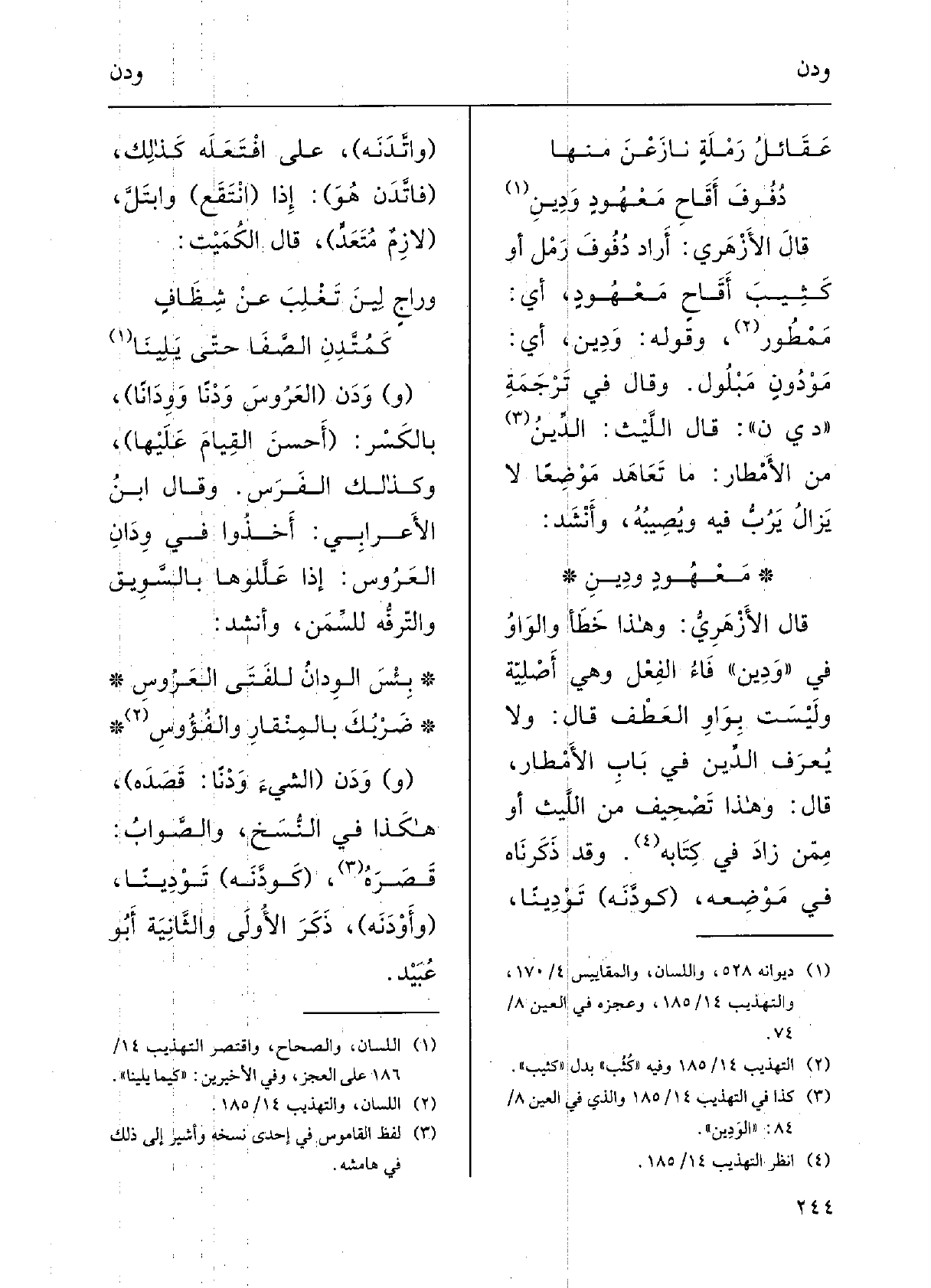 وقالَ فِي ترْجَمةِ دين: قالَ اللَّيْثُ: الدِّينُ مِنَ الأَمْطارِ مَا تعاهَدَ مَوْضِعاً لَا يزالُ يَرُبُّ فِيهِ ويصيبُه؛ وأَنْشَدَ: مَعْهودٍ ودِينِ.