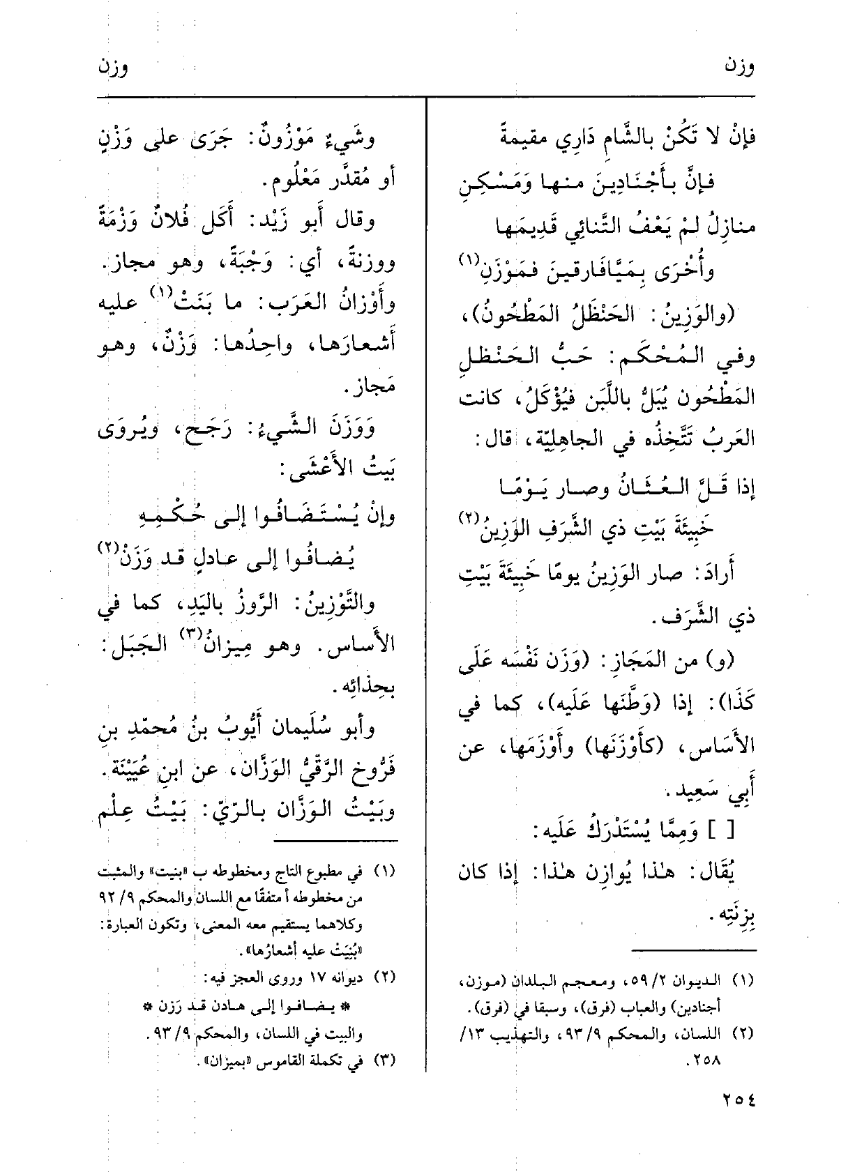 فإِن لَا تكن بِالشَّام دَاري مُقِيمَة فَإِن بأجنادين مِنْهَا ومَسْكِن منَازِل لم يَعْفُ التنائي قديمهاوأخرى بميّافارفين {فمَوْزَن (} والوَزينُ: الحَنْظَلُ المَطْحونُ) .